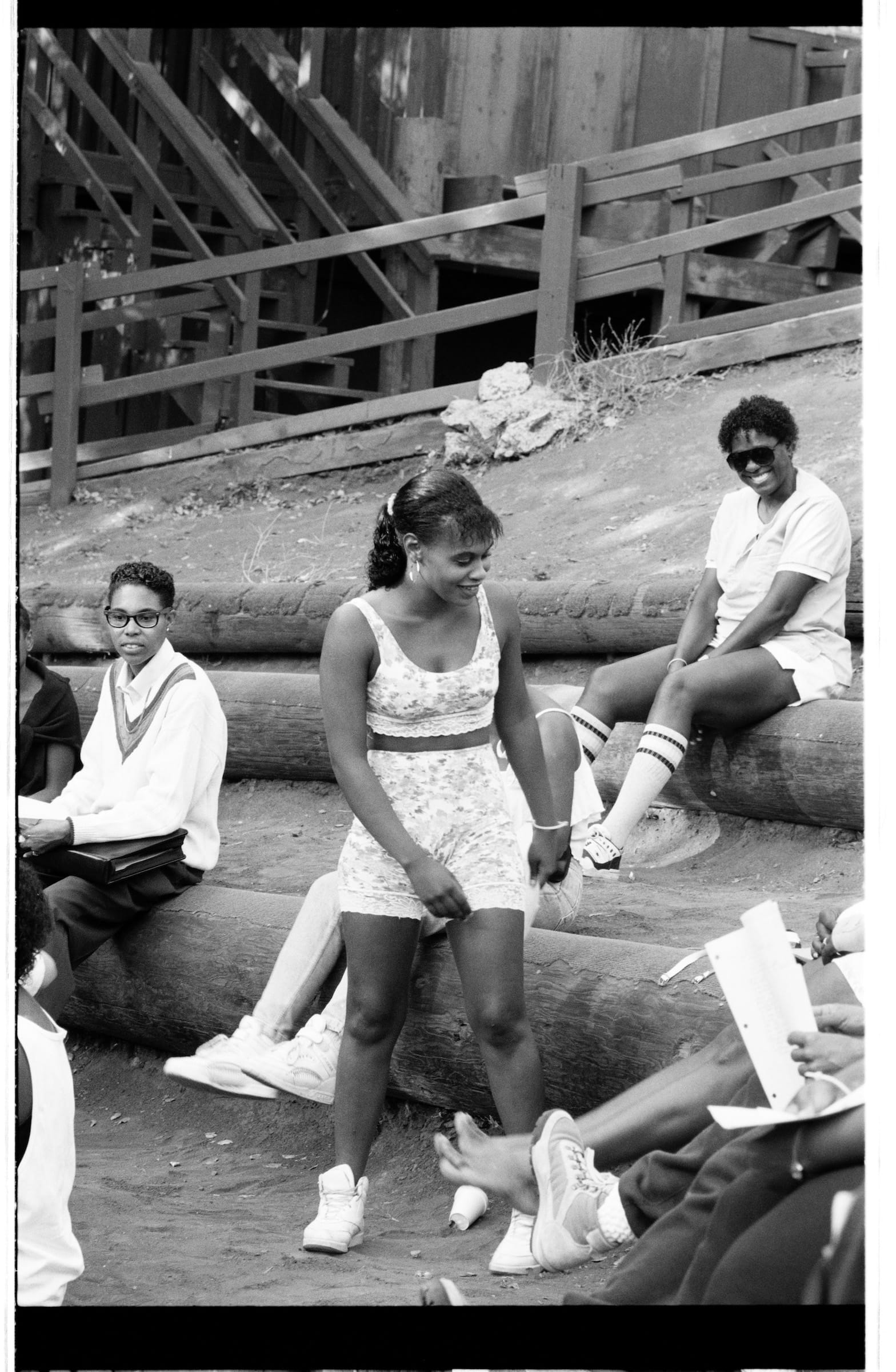 Even as Weisinger manages to render highly personal depictions of her more famous subjects, her real power lies in the photographs of people whose names don't appear in history books. In 1996, Weisinger traveled to Sistahfest, a Los Angeles festival started in 1990 by the United Lesbians of African Heritage. The artist takes a perfect snapshot — a young woman in a matching two-piece outfit smiles at someone sitting beneath her. In the riser above, another woman sports a full-face grin. The focus of the two women's attention exists outside the frame, making Weisinger's encapsulation of the scene's energy and levity even more impressive. As she looked back at other photographs in preparation for the Alice Austen House exhibition, Weisinger had forgotten where or when she captured the faces of unknown subjects. In one image, she portrays a woman who stares directly at her, appearing confident and poised: Weisinger has granted her the same dignity she affords subjects speaking on a stage. In examining the photographer's vast oeuvre, it becomes exceedingly clear that Weisinger took care to create an atmosphere of comfort from the other side of the camera.
