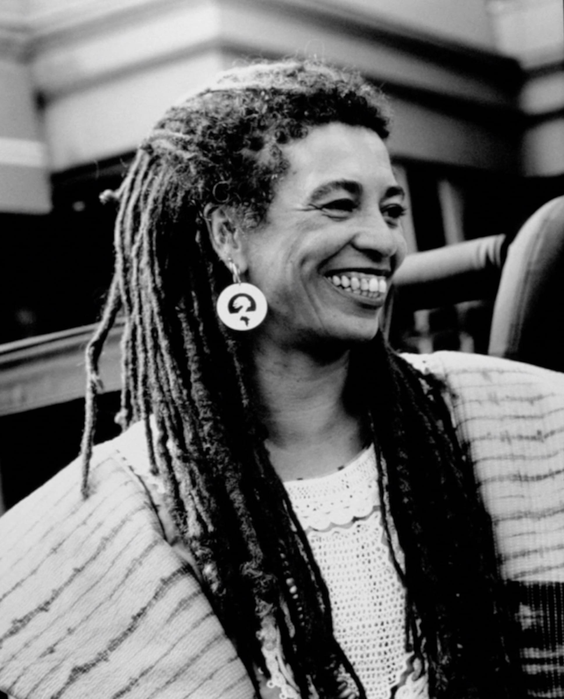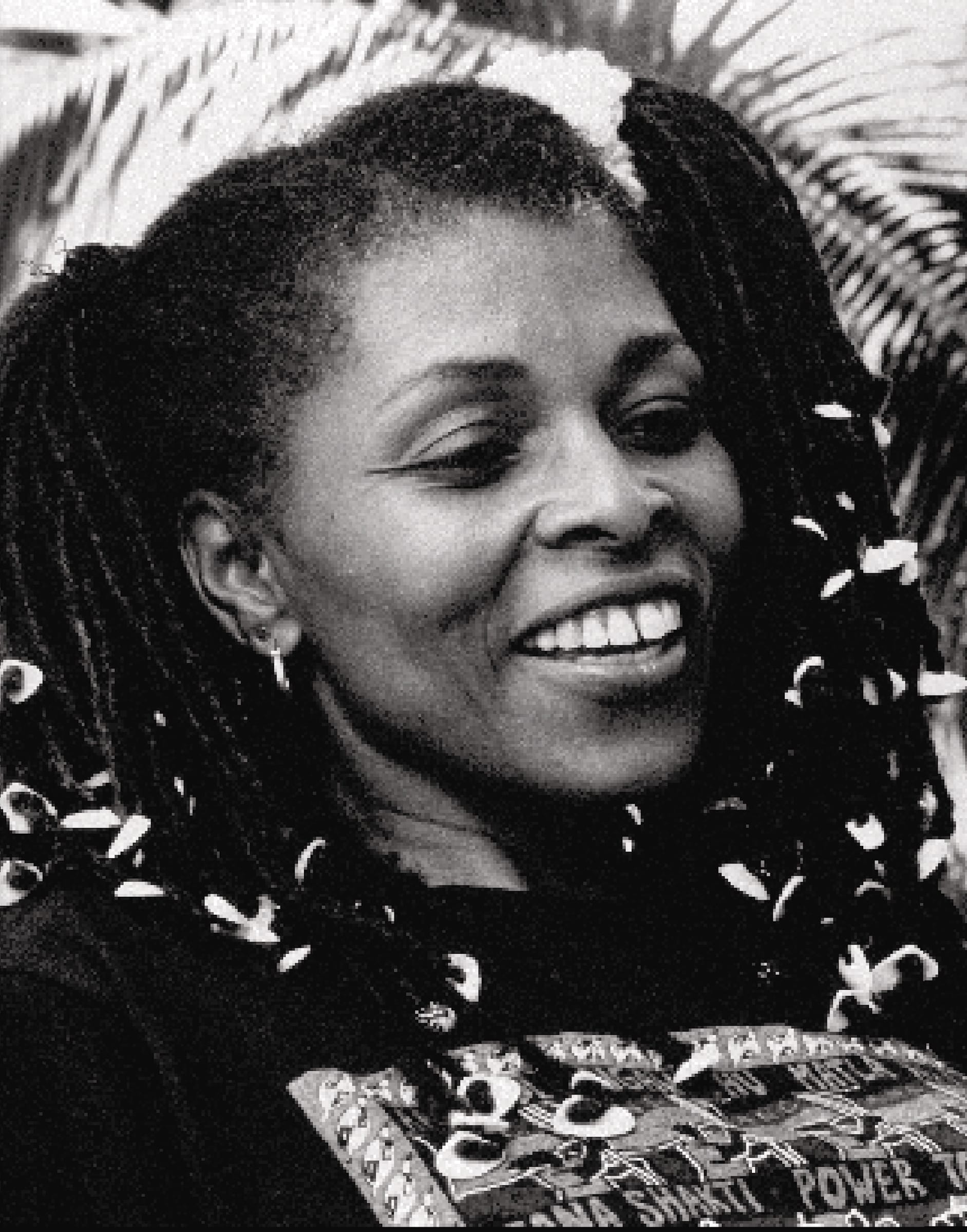 Weisinger photographed many other activists who were critical to Black feminism and the ongoing struggle for civil rights equality. She met Assata Shakur in Cuba in 1992. The Black Panther and member of the Black Liberation Army was giving a talk, and Weisinger asked to photograph and interview her; Shakur agreed. The resulting portrait is a close-up of the smiling activist, who wears shells in her hair and a shirt that reads "Shakti; Power." It's a striking depiction of Shakur's optimistic self-rendering during her exile in Cuba, and she appears mid-laugh and at ease.