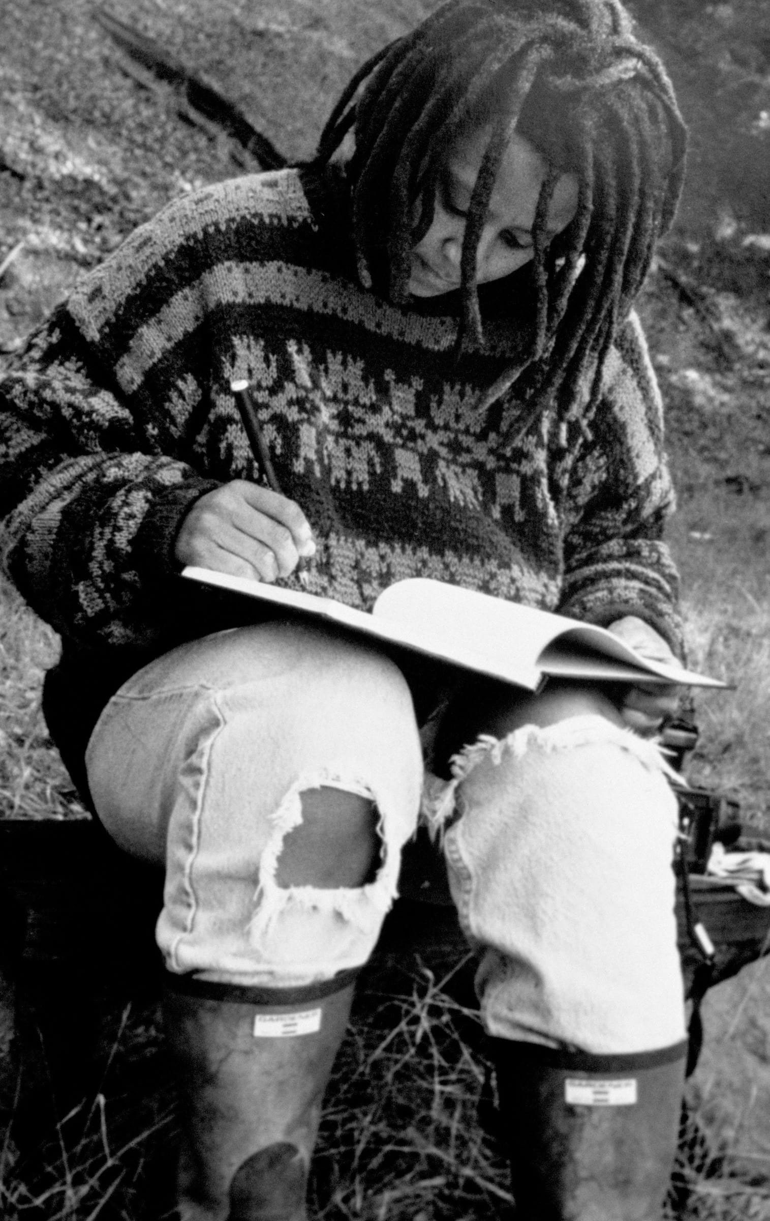 In the museum's small backroom, the show's photographs flicker across a screen in a 17-minute slideshow. The soundtrack is a compilation of Munro's and Weisinger's phone calls. The photographer speaks slowly: At the other end of the line, she looks at each photograph and narrates both the life story of the subject and the tale of how she arrived behind the camera that day. In one thoughtful self-portrait taken at Alice Walker's home in northern California, Weisinger explains that her five-year-old grandson Ivory had just pulled a small boat out of the water, and she decided to take a photo of herself journaling, a practice she's maintained since she was 14.
