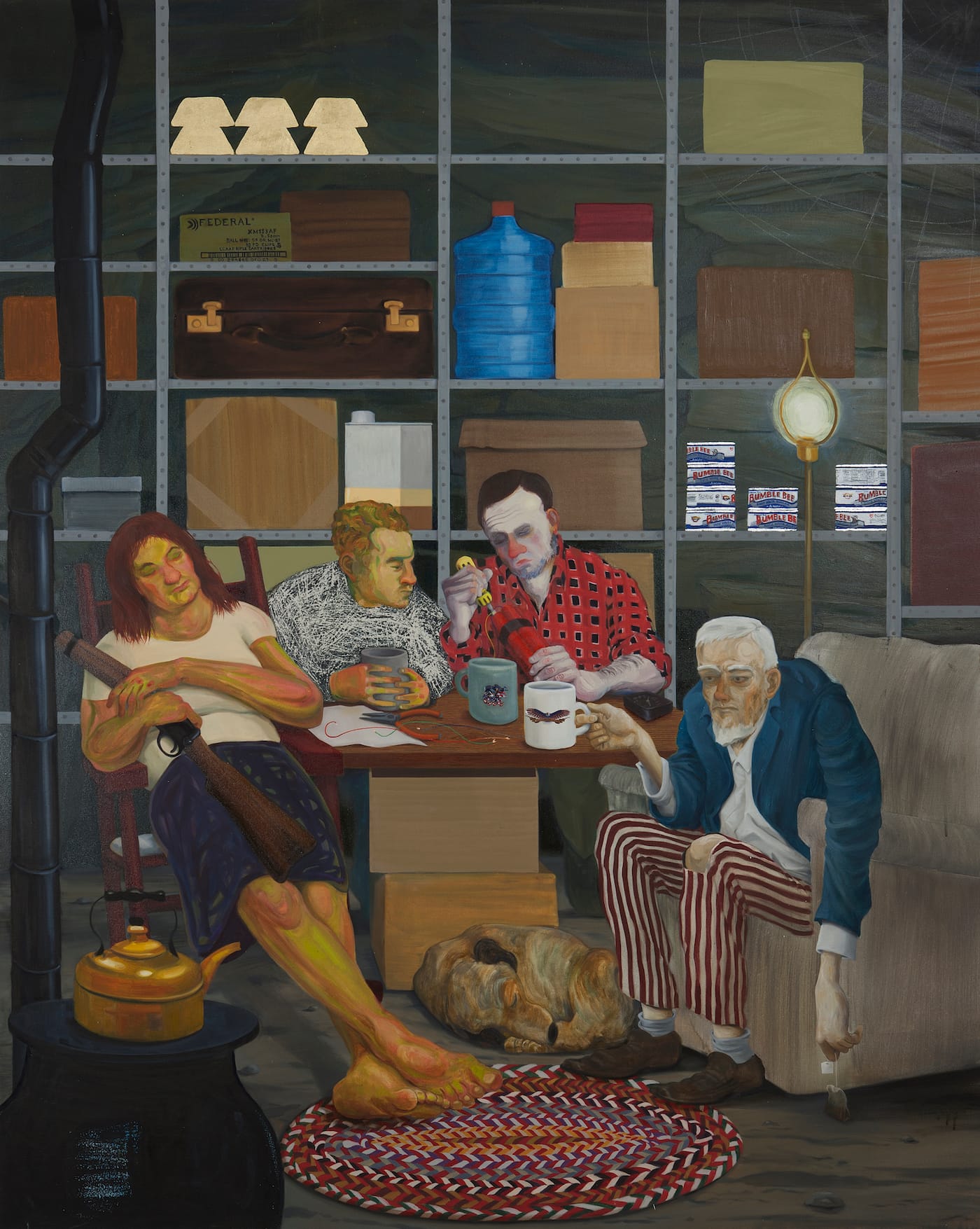 Look at the individualized faces and poses of the motley men in “Tea Party” (2011), as compared to the generic types in “Dysfunctional Family,” and you get a sense of the seismic change that has taken place in Eisenman’s work during the first decade of this century. In “Tea Party,” as in other recent paintings, Eisenman’s attention to detail adds another layer of meaning and feeling into the work. Once you take your eyes off the three disgruntled men and a woman asleep cradling a rifle, all gathered around the makeshift table, most likely in someone’s cellar, with one man working on a dynamite bomb, you notice the patriotic emblems on their coffee cups, and, on the grid of metal shelves behind them, stacks of blue Bumble Bee tuna fish cans, gold bars, a blue water cooler bottle, and a large box of rifle cartridges with their specifications lovingly rendered. In making these changes, Eisenman moved away from an “us – them” world-view, which was true of much of her work in the nineties, to one that is infinitely more personal and nuanced. In the process, her humor and emotional depth gained many more notes.
