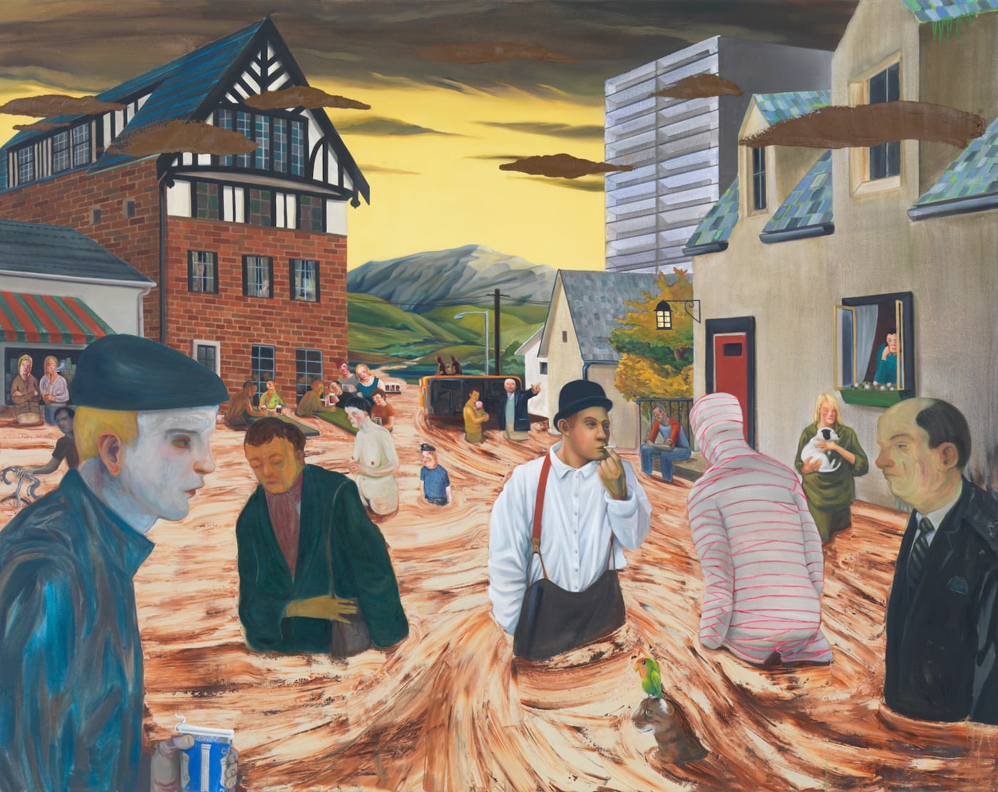 In “Coping” (2008), a group of citizens – including one wrapped like a mummy in white strips edged in red – determinedly make their way through the caramel-colored sludge that fills the streets of their weird Bavarian town. Smeared slabs of brown paint hover above them. The painting is allegorical, but the artist doesn’t provide a key, leaving viewers to determine the cause of the calamity. On a formal level, Eisenman’s placement of figures within a receding space is masterful, while her attention to detail further animates the scene. I cannot think of anyone else who does this with the ease that she does. Stuck in the muck like everybody else, the brown cat with a green parrot on its head, in the middle of the painting’s foreground, is one of the many quirky things the viewer is apt to be delighted by in an Eisenman painting.