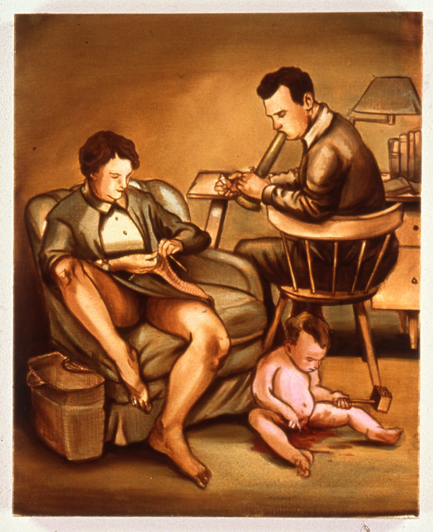 In the largely sepia portrait of 1950s domesticity, “Dysfunctional Family” (2000), which is one of the earliest paintings included in Al-ugh-gories, Eisenman depicts a suited man seated in a wooden chair. He is holding a battery in one hand and, for some inexplicable reason, blowing into a phallic flashlight (or is he taking a hit off a bong). Next to him, the woman on the sofa chair is knitting, her awkwardly splayed legs revealing that she isn’t wearing any underwear. As if this wasn’t enough to make a Freudian psychiatrist yelp, perhaps with perverse delight, on the floor beside them, their naked toddler son, who has pulverized his penis with a meat tenderizer, is busy poking his finger into the blood gathered round him, curious about the red substance. The nearly monochromatic painting is 21 x 17 inches so viewers have to get up close to the surface to see what is going on. The deliberately generic drawing of the figures within a limited palette tones everything down, makes the scene seem emotionally distant – like something we might see momentarily in a dream – until we realize what’s going on. Need I say more?