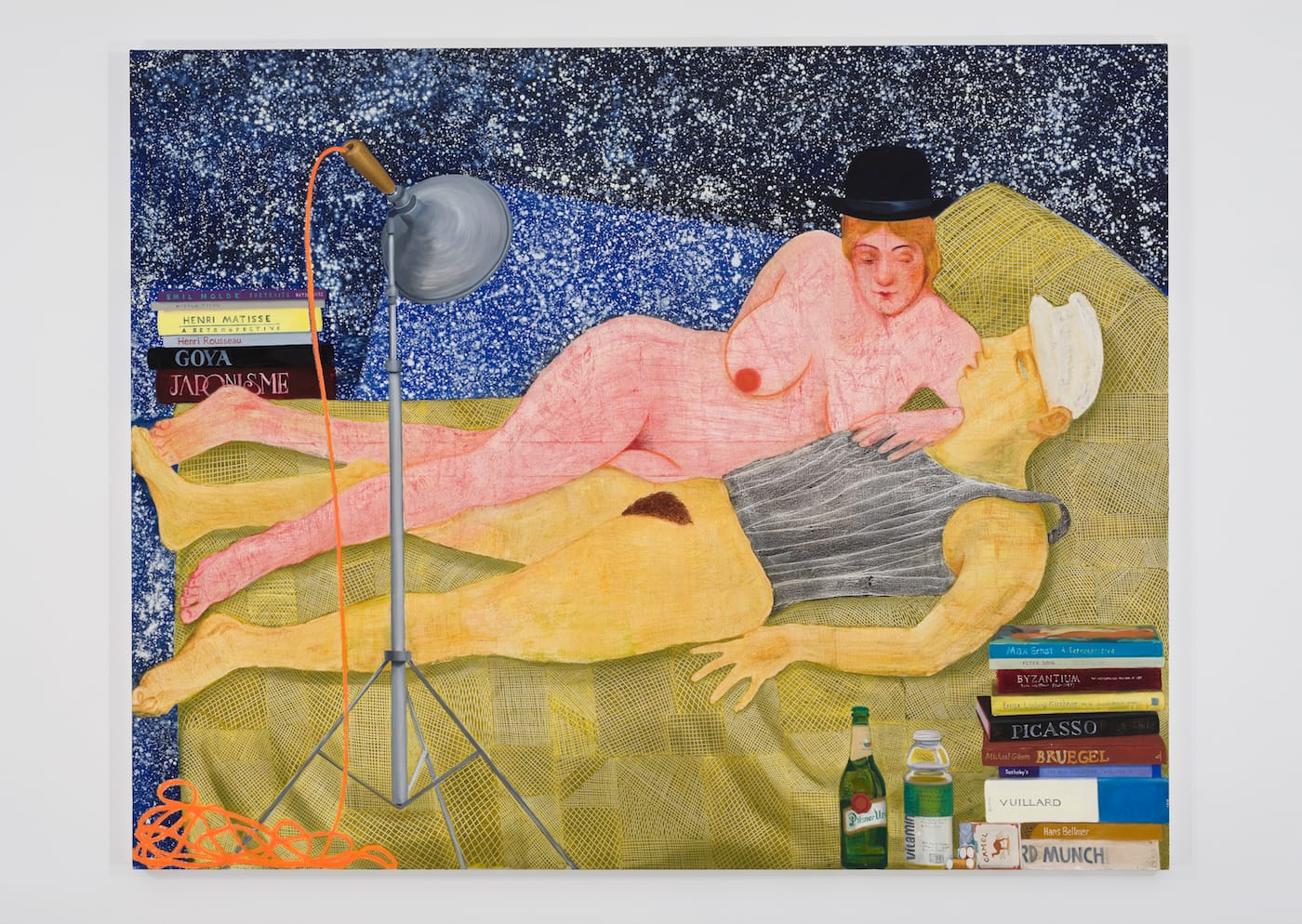 In “Night Studio” (2009), Eisenman depicts two women in bed. One woman, whose skin is yellow, is lying on her back, wearing a white sailor’s cap, while the other, who is pink and turned towards her lover, is wearing a bowler. They are lying on a bedspread made of a myriad network of lines – little grids fitted together – that artist has patiently scratched in the pale green paint, infusing the intimate scene with a tactility that hints at weaving and passionate violence. Equal attention is paid to the two piles of books, bottle of beer and vitamin water, and pack of Camels. In these things one sees all the contradictions of everyday life surrounding them, and the choices they have made. In this and other paintings – “Is It So” (2014), which depicts lesbian cunnilingus – Eisenman introduces subject matter that has hardly ever been seen in paintings hanging in a museum or gallery. By cheerfully undermining unspoken taboos, she reveals much about the repressions governing art. Like Guston, who broke conventions, Eisenman, who quotes one of his motifs, breaks others.