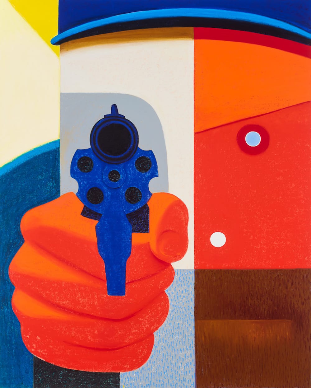 Another subject is signaled by the title of two large related paintings, “Shooter 1” and “Shooter 2” (both 2016), in which a cropped, abstracted face points a gun straight at you. Across from each other, the gun’s round black muzzle and the face’s coldly impersonal eye (or camera lens) are chilling. These paintings remind us that unexpected invasions and threats are basic staples of life. We can’t assume that everything is going to be all right. The best we can do is to manage our worries so that we are not at their beck and call.