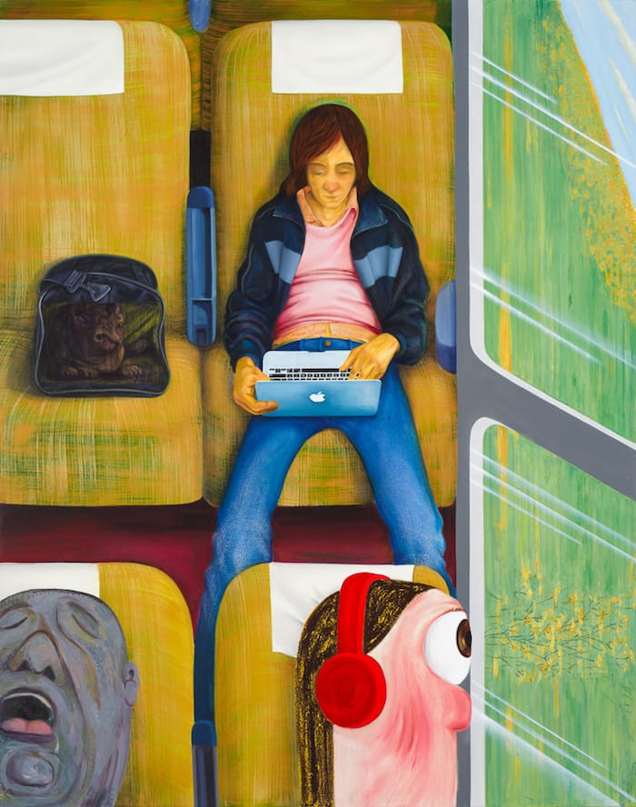 In the angled, bird’s eye view of “Weeks on the Train” (2015), a figure in a jacket, pink sweater and dungarees sits on a train, looking at an open Apple laptop. The figure’s gender is not immediately apparent, another indication of Eisenman’s eye for the choices that people are making today. A cat in a carrier is on the next seat. In the foreground, spanning the bottom of the composition, a truncated pink head with one large eye, wearing red earphones, gazes out the train window, at the green meadows rushing by. Next to this person, whose gender is also unclear, Eisenman depicts the large grey head of a man who has fallen asleep. His mouth is wide open and a trail of spittle runs out of the right corner. From imprisoned in a carrier, to looking at a laptop, to listening to headphones, to sleeping – everybody exists in a completely separate world. By painting each individual in a different style and color, Eisenman underscores her belief that we are more different than alike, and that terms such as male and female, straight and gay, don’t reveal much about the individual to whom they are applied.