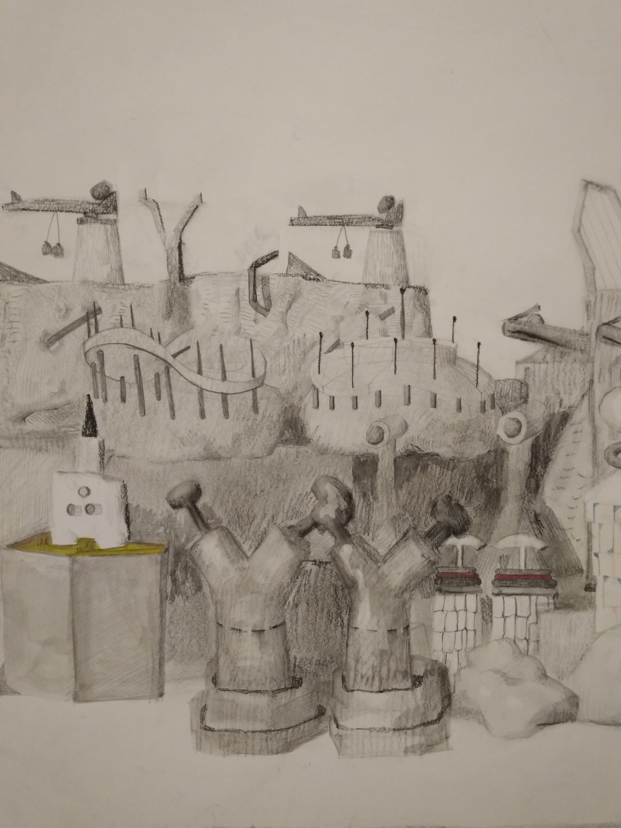 These drawings are detailed representations of various landmarks on the mothermap, some of them over six feet high, on several sheets of paper joined together. The Museum of Memory Fragments, for example, was built to house the collection of a man who spent his life wandering throughout My Land collecting ordinary rocks. The museum has a fantastically complex cataloging system, owing to its unusual structure: the building “has two timelines and fourteen spatial dimensions.” Another drawing depicts the Institute of Volume, which is devoted to determining the volume of two-dimensional objects. It accomplishes this impossible task by using a “paradoxical tool,” a circular protractor that can measure “spherical angles.”