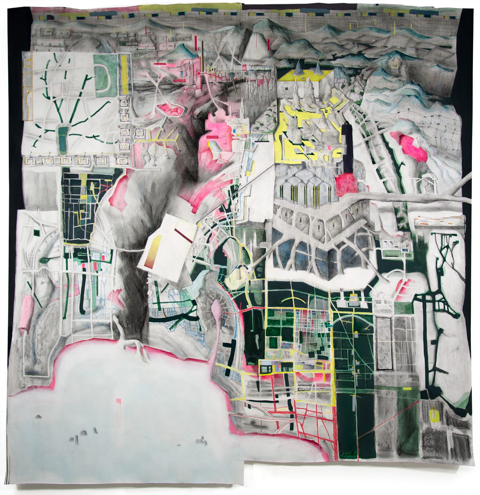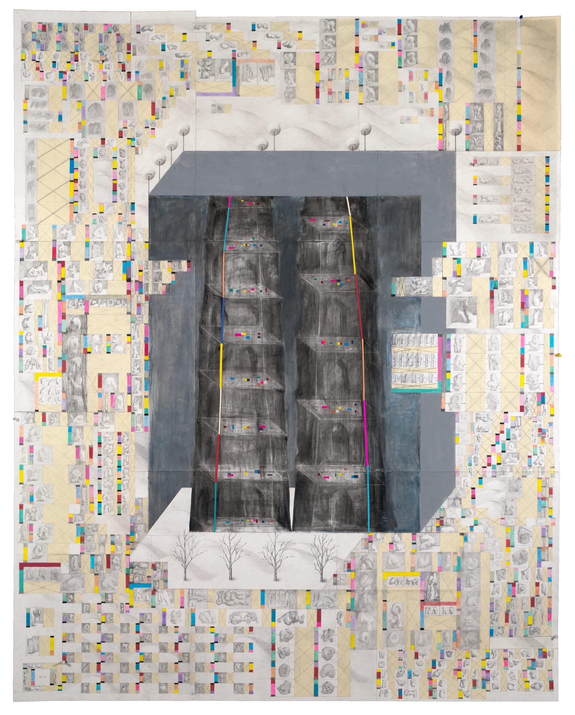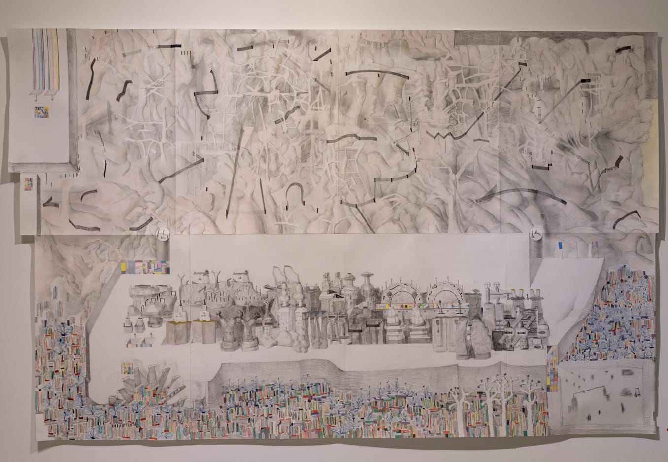 It may sound drily cerebral, but the drawings themselves have a vibrant, intense inner life, varying in tone and technique. Some of them possess the mysterious quality of Song landscape painting, with monumental structures exquisitely rendered in graphite textured to resemble granite in mist. Other drawings are governed by enigmatic color codes, symbolic documents for which the key has been lost. Scale in the works fluctuates wildly; occasional close-ups reveal elegant sculptural forms that suggest a Surrealist dreamscape, with no discernible references to human civilizations past or present, while others have a medieval feeling, echoing background vignettes in a Brueghel painting, without people.