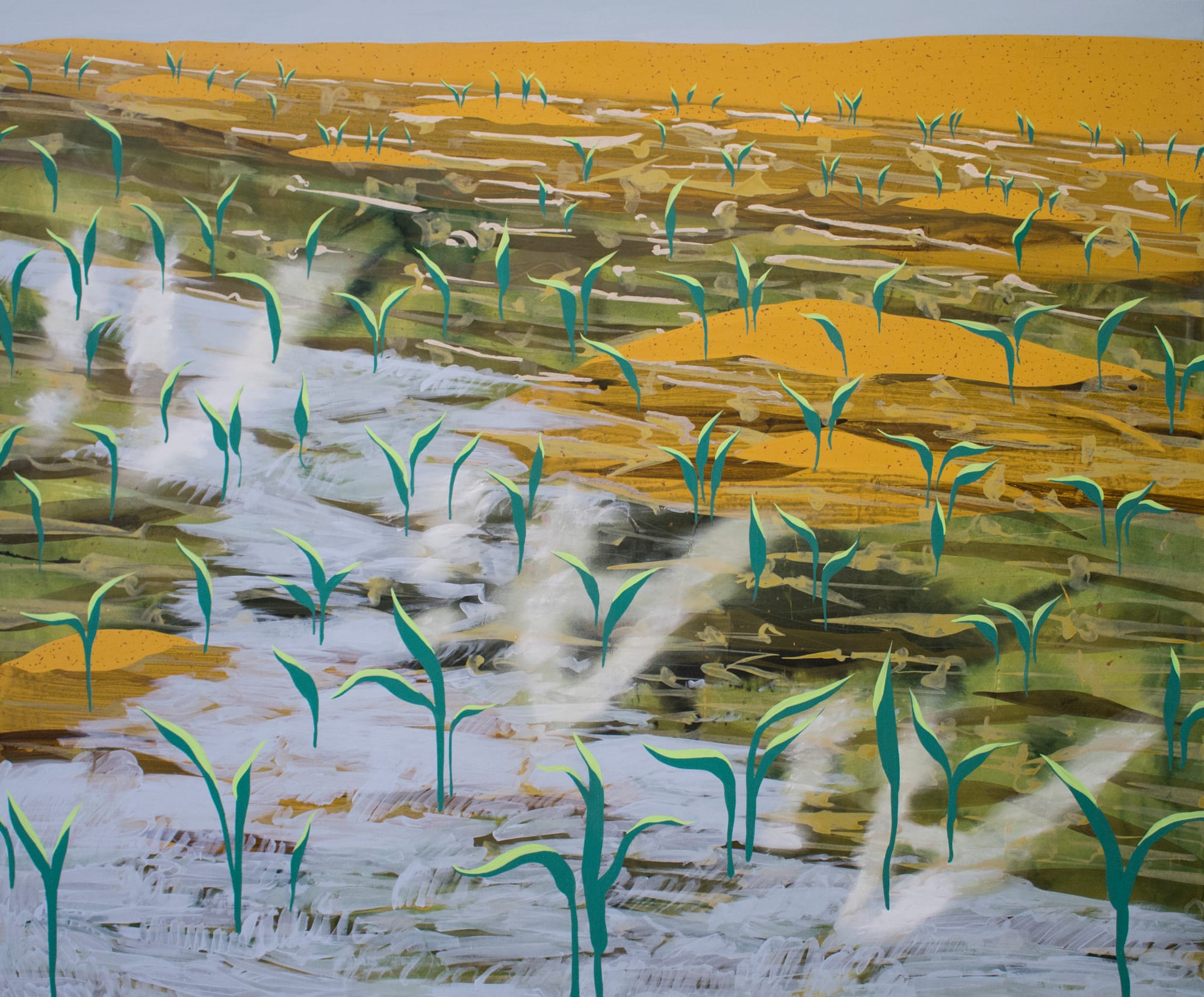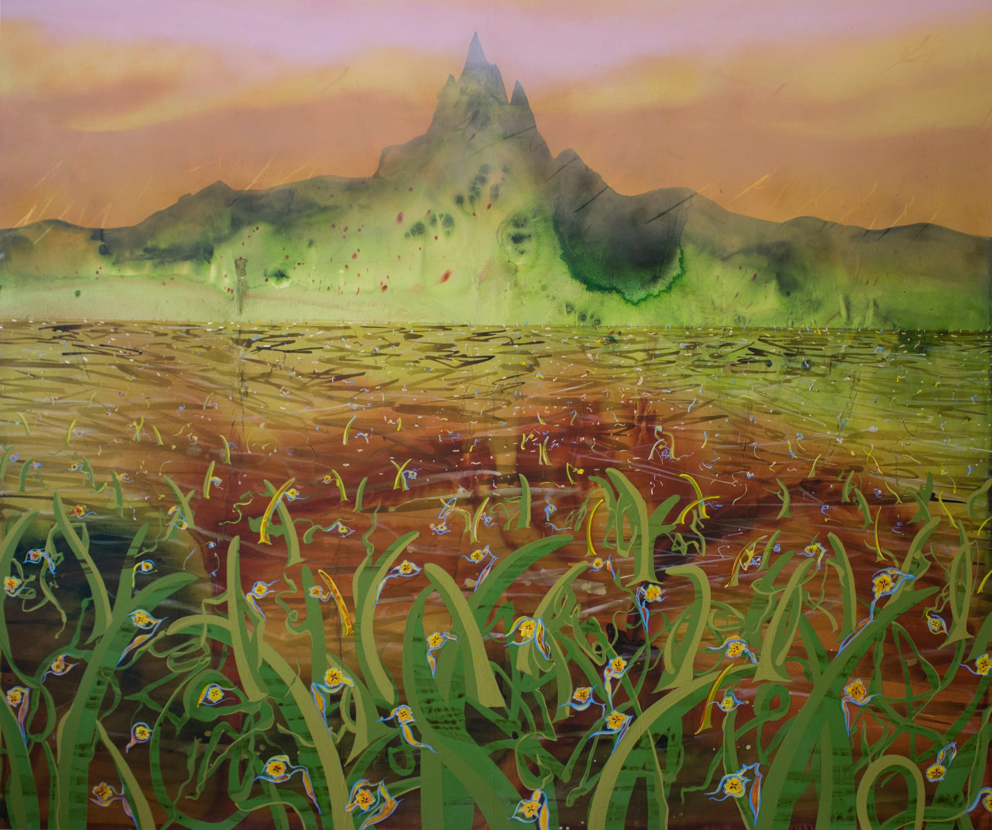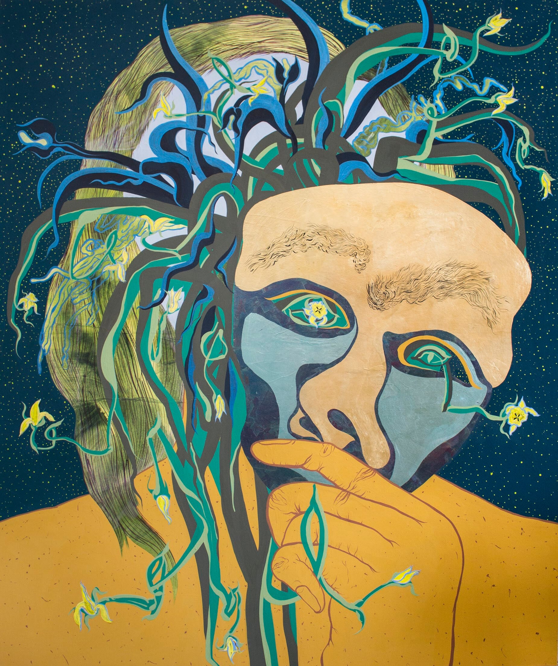 In her paintings at the Factory, executed in a virtuosic array of media, Nguyễn enlarges Narcissus’s tragic dilemma to a global scale. Humanity’s self-absorption repudiates the power of Nature, as our species’ self-love has created conditions that endanger the very viability of life on earth. Ovid’s story takes place in the confines of a pool of water in a forest glade; Nguyen’s vision embraces the planet. In her telling, the flood of Narcissus’s tears carries him to the waters of the ocean, to the core of the Earth. There, he is rebirthed and transformed, and he repopulates the land with his own floral incarnation, just as human self-love has refashioned the planet in our own image.