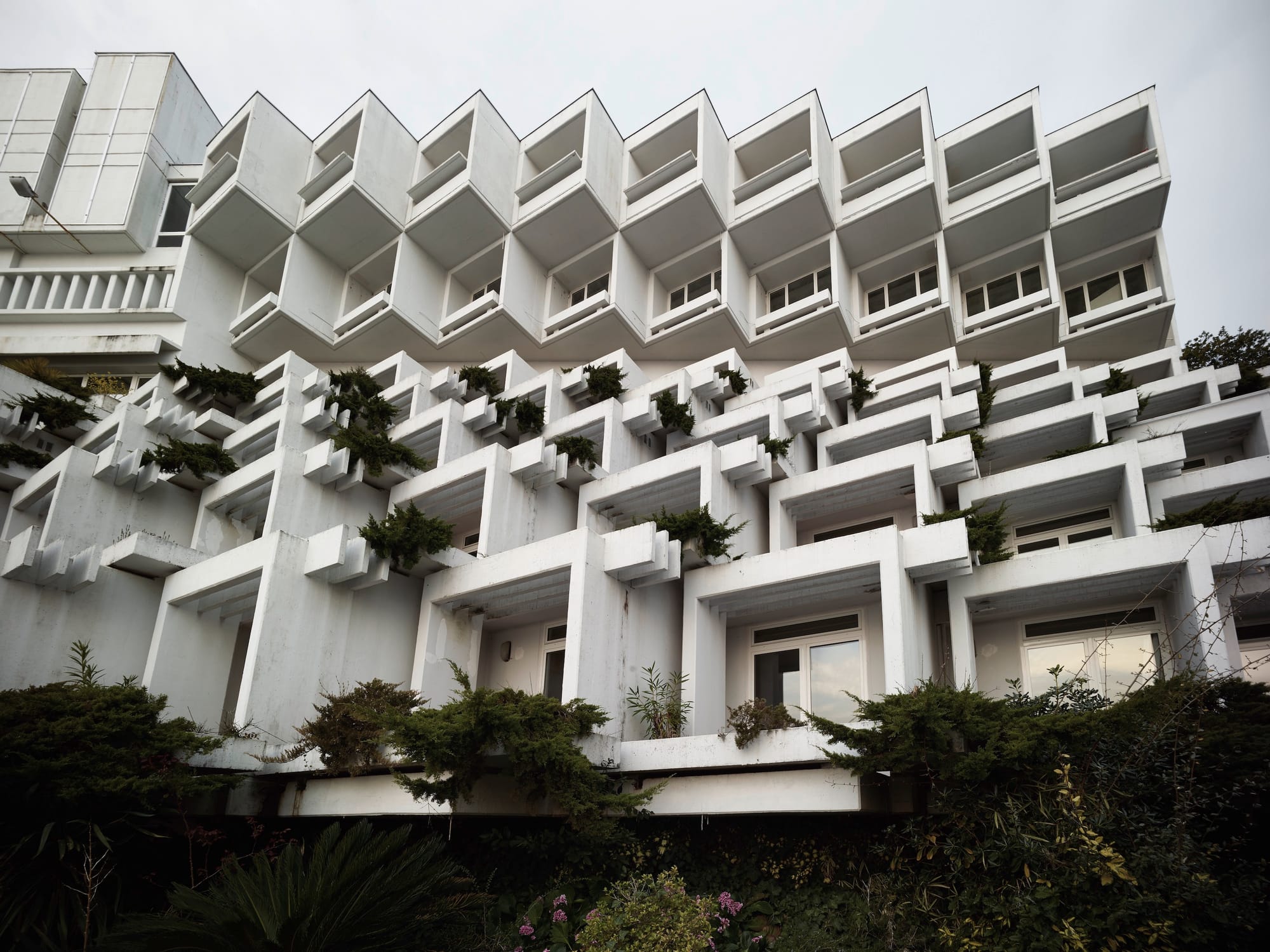 This clever choice allows the visitors to appreciate the sophisticated interplay between the buildings and the natural landscape. Brutalist in style, dense concrete structures like Branko Žnidarec’s Hotel Adriatic II nevertheless wrap themselves organically along the curves of the rocky shore, achieving a high capacity of accommodation with minimal incursions into the topography. The surrounding landscape was kept pristine through strict regulation and a policy of universal free access: new developments were built at least 300 feet from the shoreline and the space in between was declared public land accessible to all.