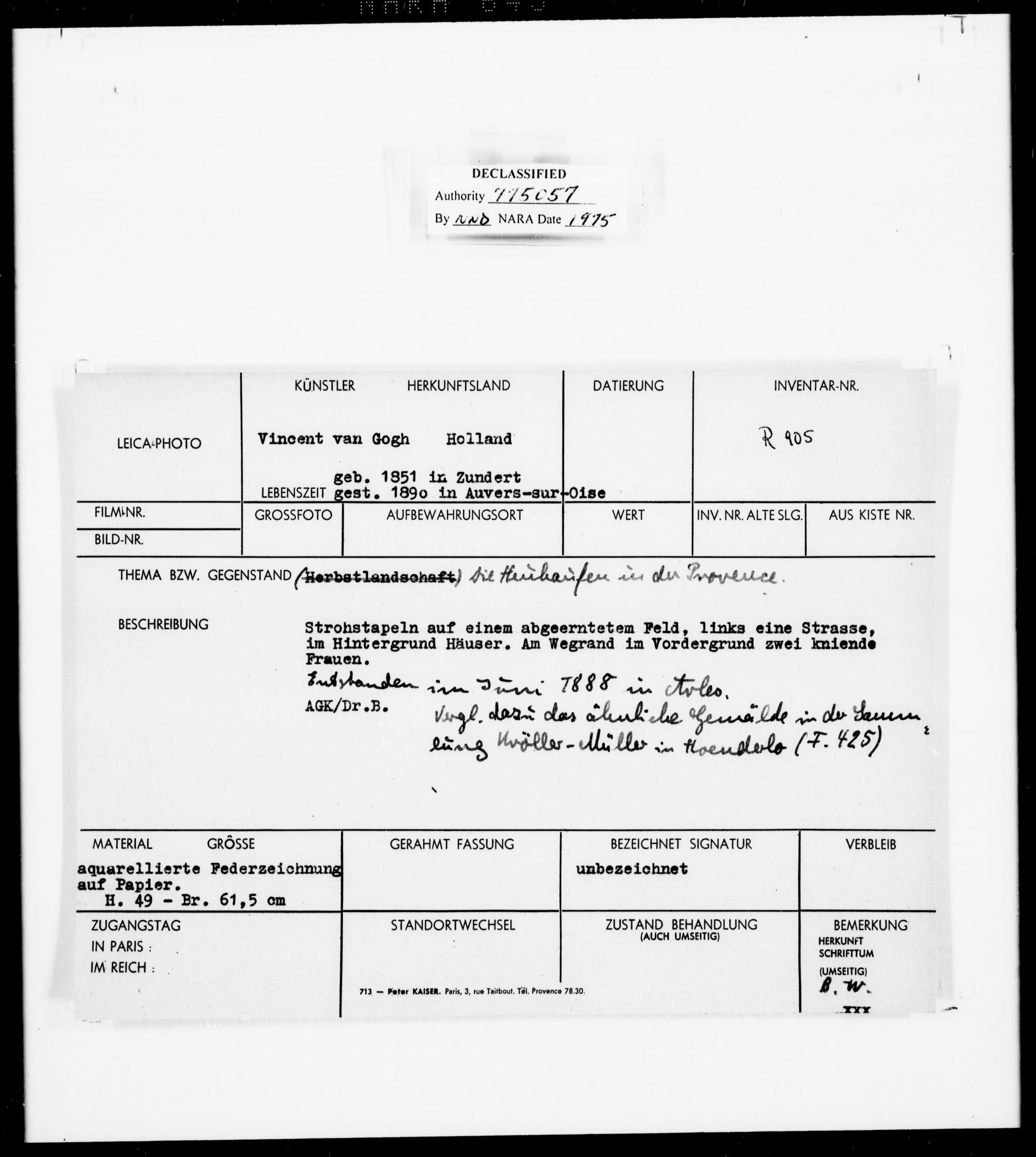 If this painting did come from Lohse, he may have used an elaborate ruse to bring the painting to market, concealing his identity through foundations. This seems to have been his modus operandi for moving paintings after the war. However, there is nothing in the record that directly connects "Meules de blé" to Lohse.