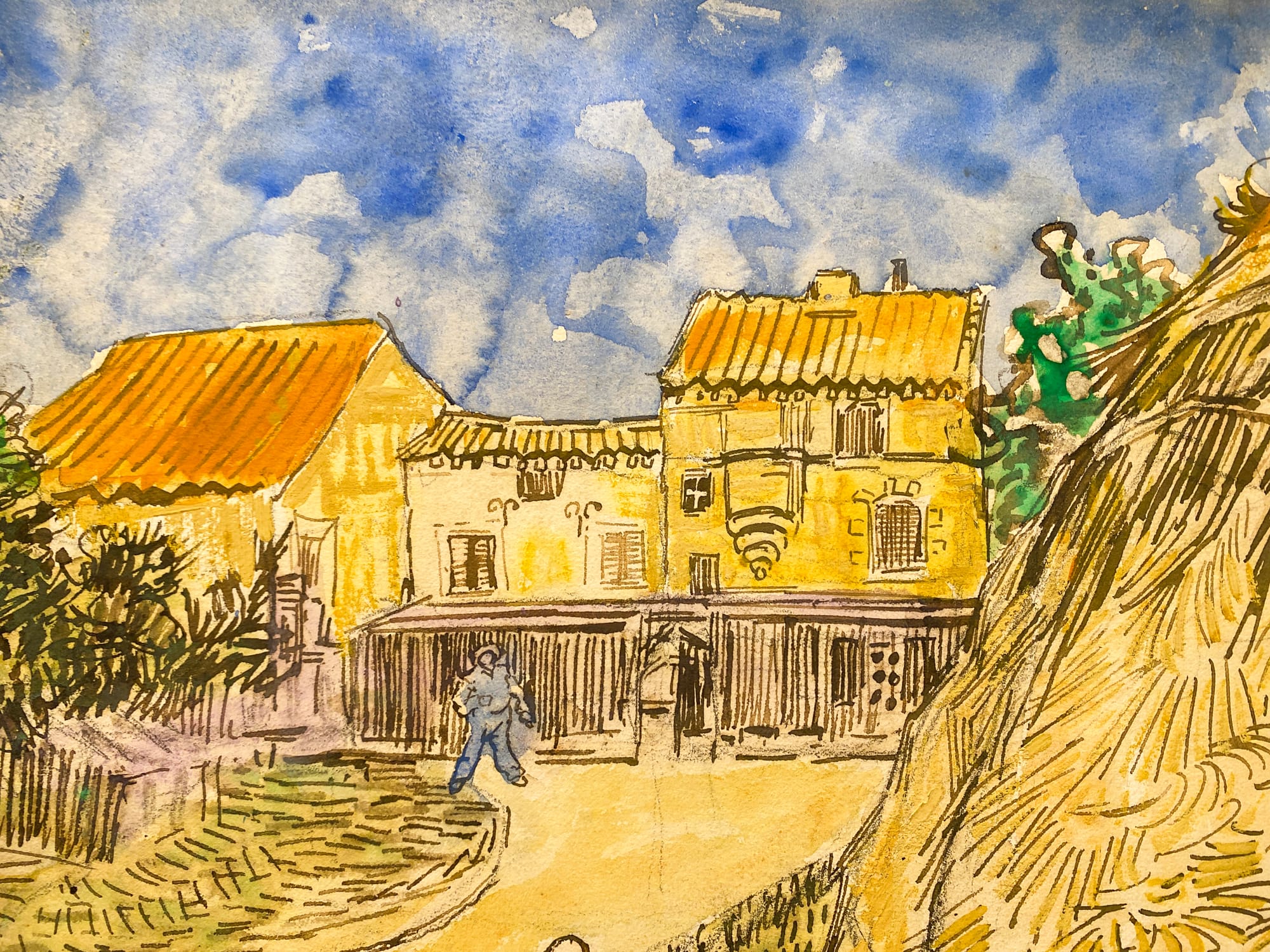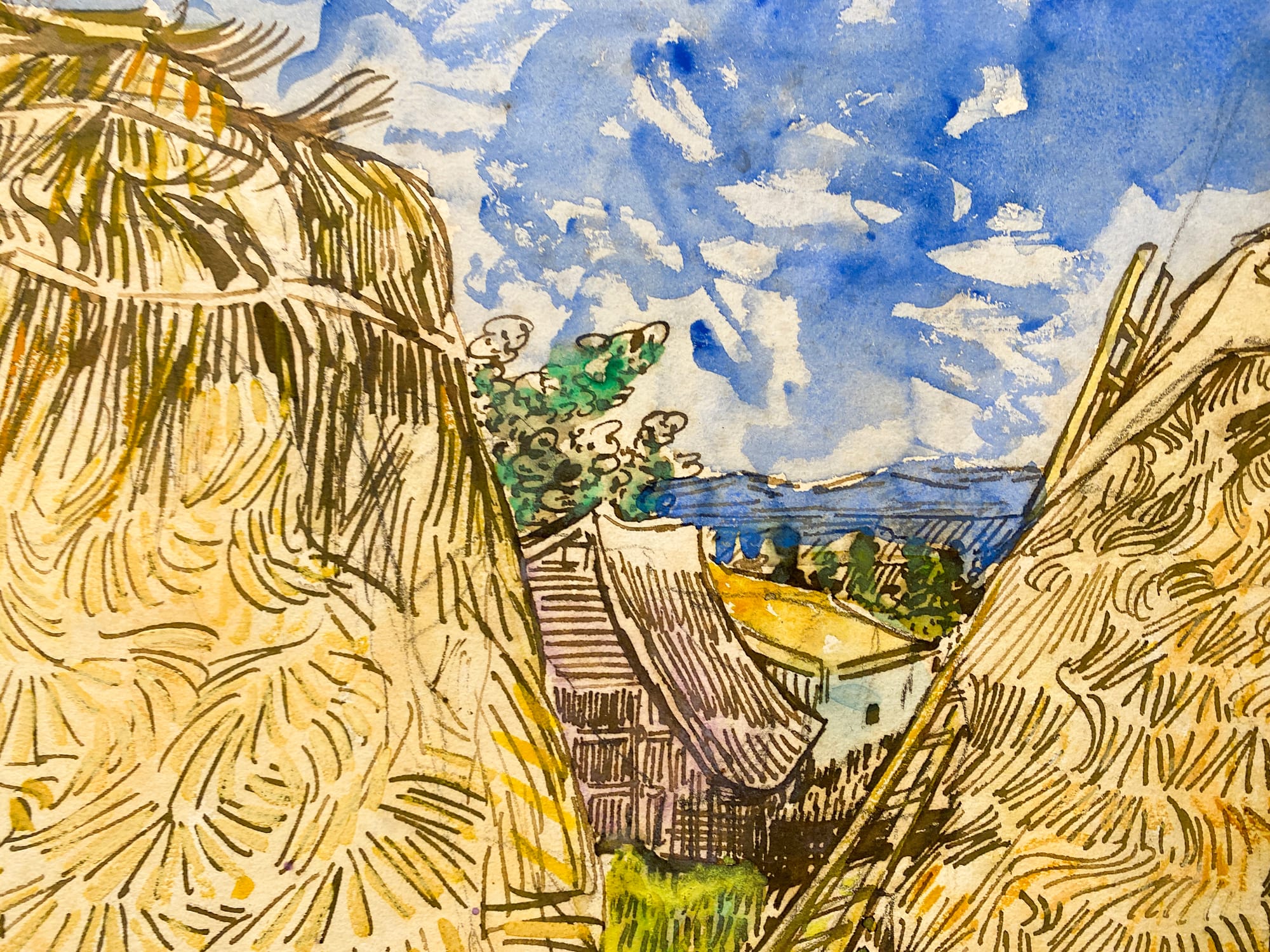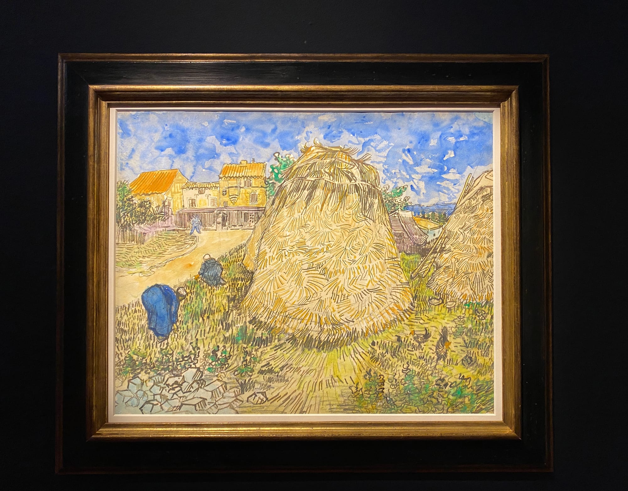 Within the Cox Collection, "Meules de blé" commands our attention. It is the only watercolor, showcasing van Gogh’s signature brushstroke in a light, featherweight way. He applies the disciplined drawing techniques he developed from his earlier career as a draughtsman. The painting makes visible his precise stroke work, done in pen and ink over pencil. It demonstrates a sense of control that contradicts a prevailing narrative about van Gogh’s work: that his style reflected his deteriorating mental state. While the wheat stacks are the main subject in the painting, the buildings in the background reveal van Gogh’s acute attention to detail. Tomorrow, "Meules de blé" is expected to set a new auction record for a work on paper by van Gogh, with a sale estimate between $20 and $30 million.