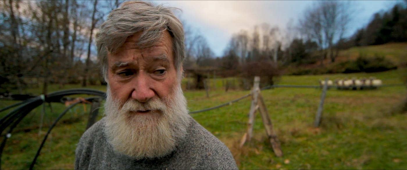 The film begins and ends with a series of unceasing dissolve sequences that portray the understated beauty of Peter’s farm: several grassy acres, flanked by a sloped forest, surrounding a cluster of wooden gable and gambrel roofed barns full of sheep, cattle, pigs, and chickens. As the winter unfolds so too escalates Peter’s suicidal, alcohol-fueled ramblings — the chiastic heart of Peter and the Farm — which soften a bit by springtime. Peter demonstrates how to kill and skin a sheep, then feeds its innards to pigs; relates how he mangled his three-fingered hand in his youth as we anxiously watch a farmhand saw firewood; and shows off a tree which he successfully fused with another cultivar in a wishbone-like formation, as well as a landscape that he ‘painted’ out of mold on a refrigerator. Peter is a strikingly self-reliant man, to such an extreme that he has burnt most of the bridges in his life. We come to accept his constant stream of epigrams (‘Life announces itself with force; death slinks off’) with equal reverence and wariness. A quick background survey of his bookshelf shows many liberal-minded titles (Guns, Germs, and Steel; The Cosmic Serpent), but I had trouble not viewing these with the same wariness as his epigrams. (Are these books stoking his materialist nihilism?) There’s always a darkness lurking in Peter, and from time to time we hear the filmmakers talking to themselves about the weight of their responsibility to look after him. There is no pretense that Peter will be better off after the film has finished.