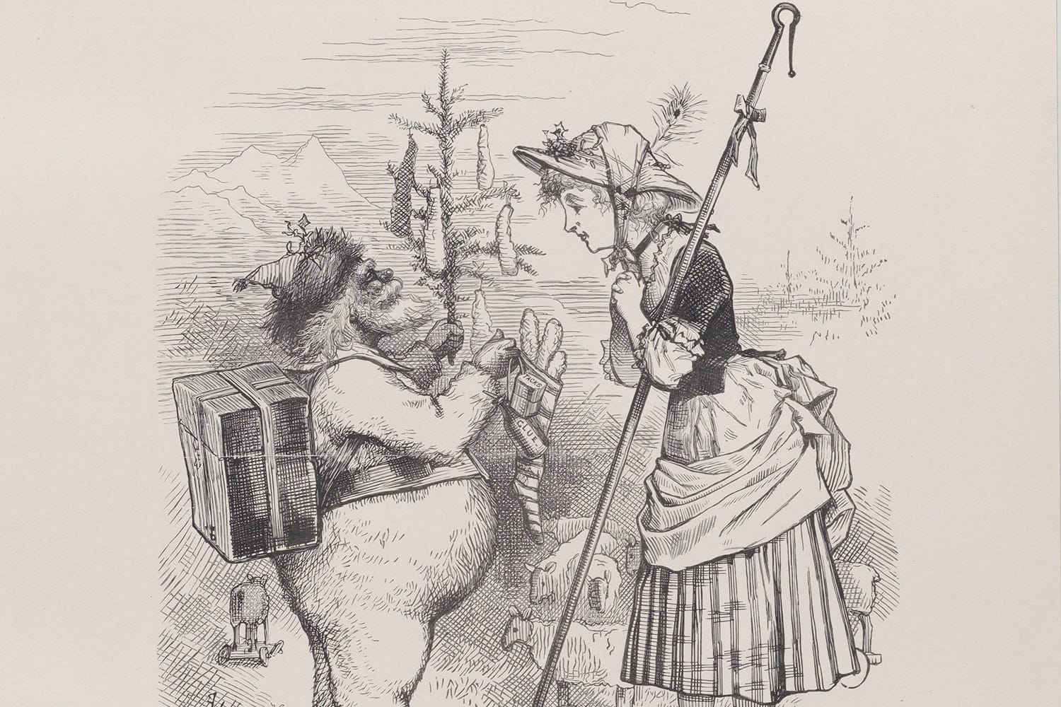 Before Nast put pen to paper, Santa was more commonly represented as a waifish, disciplinarian figure clad in a bishop’s vestments. Nast’s rendition reimagined Santa as cheerful and giving. His new mode of illustrating Santa owed to his hybridization of traditional European depictions of Saint Nicholas and Germanic folk images of elves. Many of the fantastical elements of Christmas that have since become ubiquitous in cards, children’s books, and Christmases in parks were Nast’s doing. He propagated representations of reindeer-drawn sleighs, icicle-ornamented awnings, Christmas villages, and stockings on mantles. He was also responsible for establishing Santa’s workshop at the North Pole. During his lifetime, the North Pole was a place of mystery and danger; several explorers embarked on expeditions to the Arctic, and it wouldn’t be until after Nast’s death that Robert Peary could claim the distinction of being the first to reach the geographic North Pole. Placing Santa’s headquarters there was therefore an appropriately mystical and secular choice.