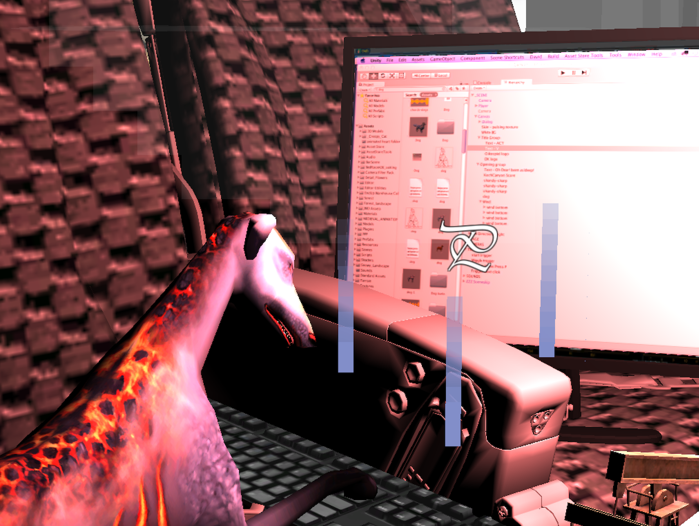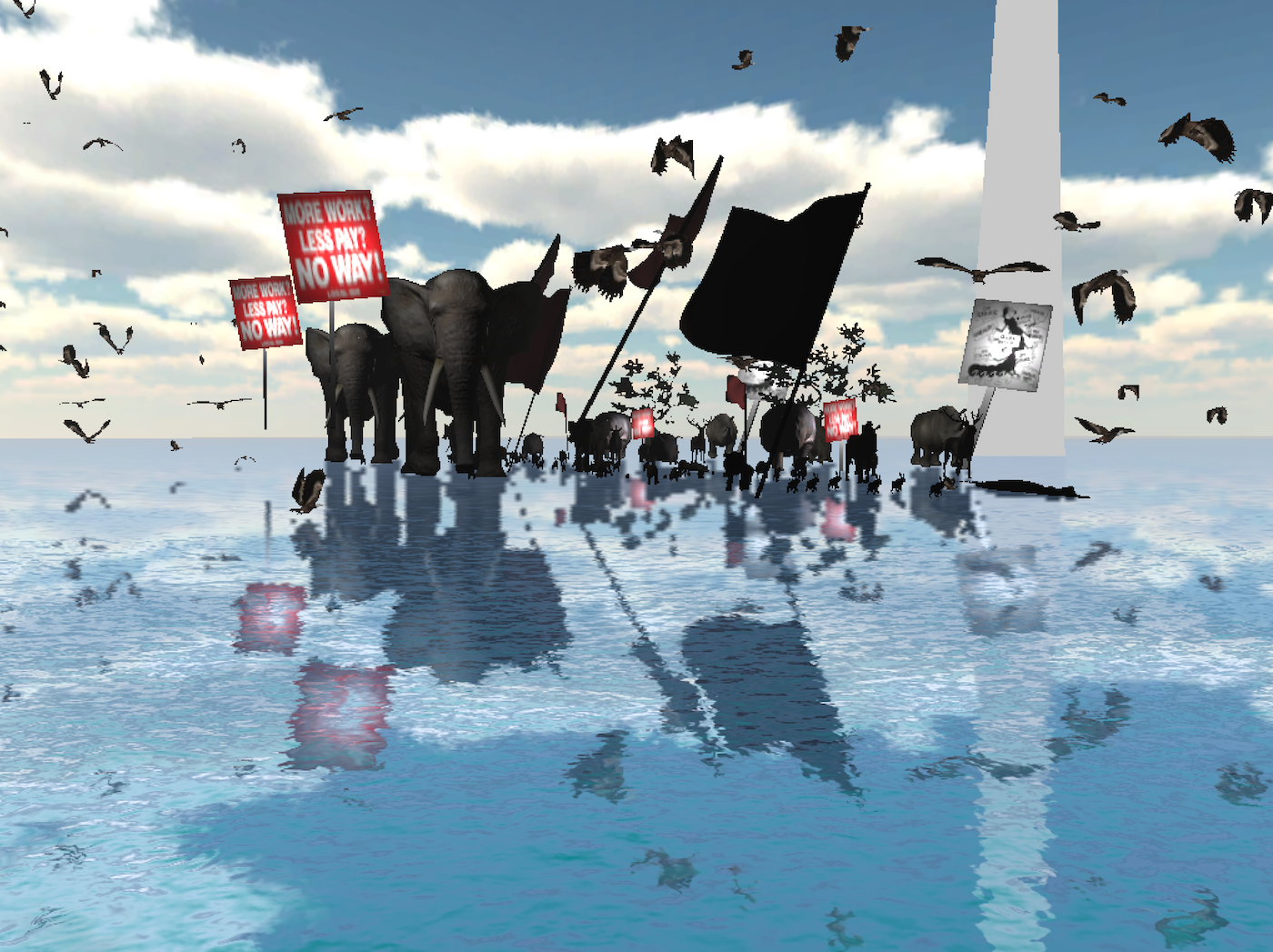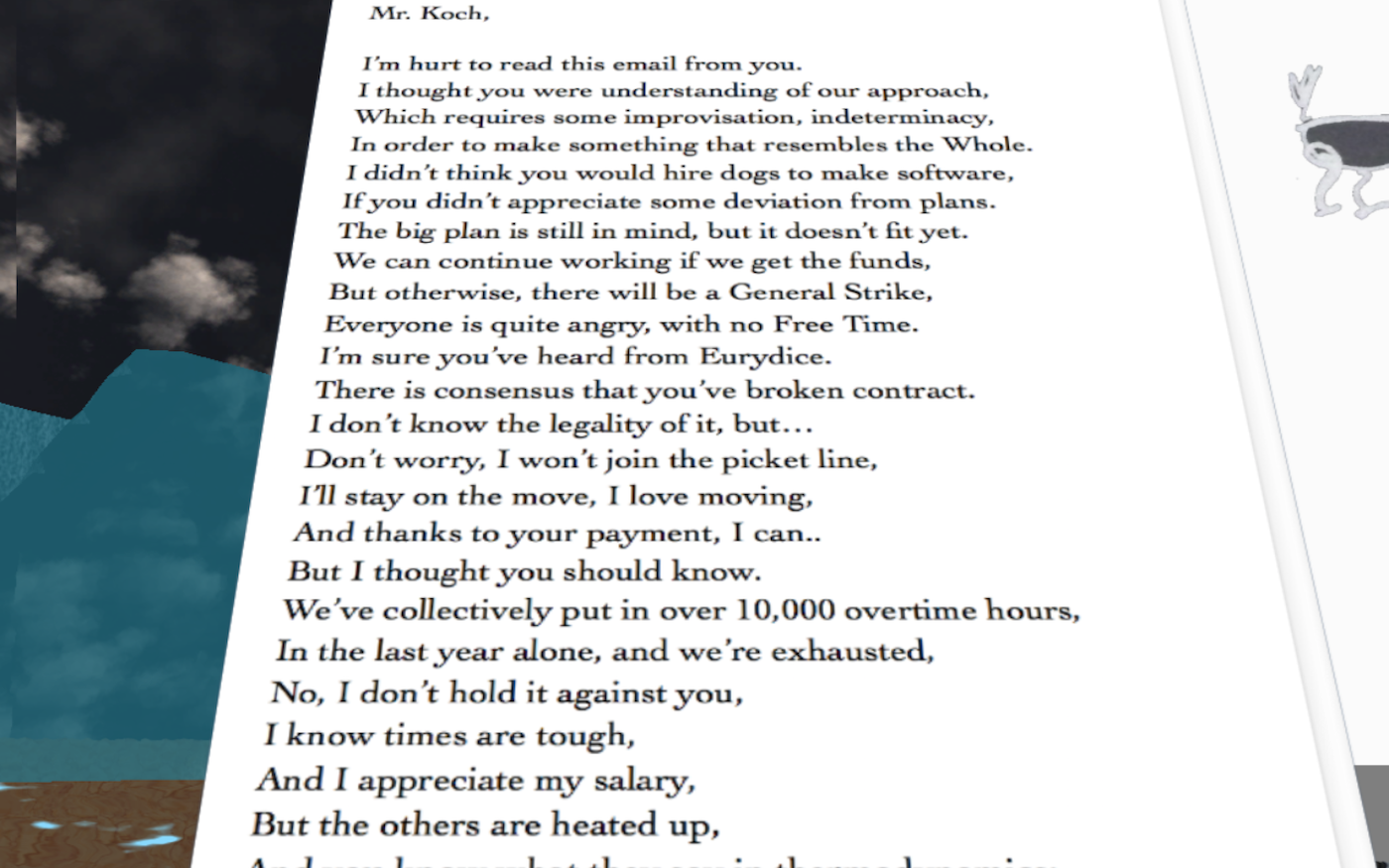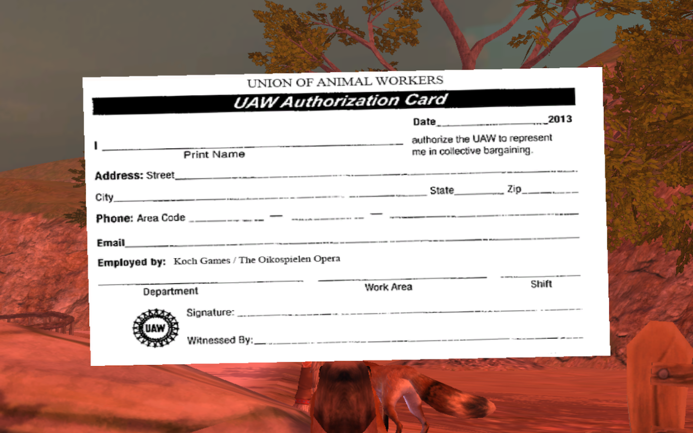 The general premise of Oiκοςpiel is that an immortal Donkey Koch (of the Koch brothers) has commissioned a group of dogs to produce a digital opera for THE GEOSPIEL, a global arts festival scheduled for 2100. A union of other animal employees is attempting to establish universal basic income, but the dog developers won’t join, and eventually serve as strikebreakers. The game more or less follows the opera’s development in a series of acts over several dog generations, with settings that range from a yoga studio in LA (for dogs) to a gated community called Emeryville North, located at the North Pole, where one of the dog protagonists pursues an artist residency.