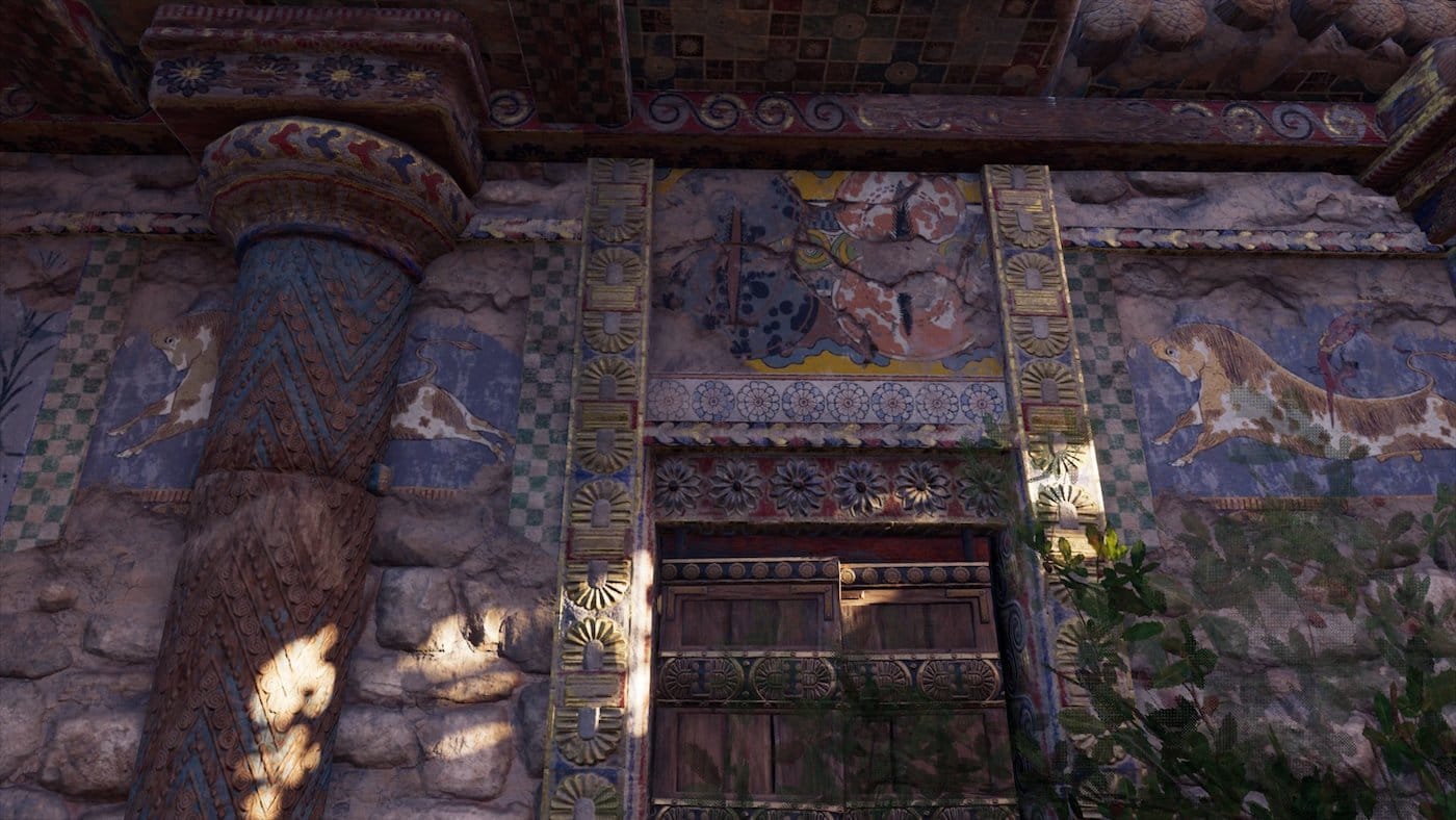 In addition, small details in the game capture the average person’s life in Ancient Greece. “One of my favorites is the merchant who has a stall right outside the entrance to Delphi and sells votives,” mentions Jones. “He has a selection of higher and lower end ceramics, as well as wreaths; we know for a fact that sanctuaries often had these businesses and I haven’t found a single temple, shrine, or altar in the games without appropriate votives.” Remarkably, there is also a clear differentiation in-game between Mycenaean architecture and other styles. The Mycenaean aesthetic is characterized by large blocks, post-and-lintel doors, corbelled masonry, and frescoes.