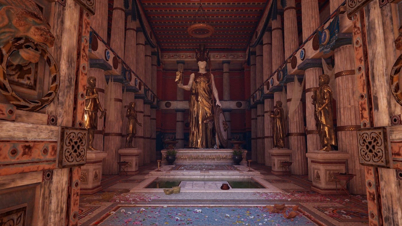 The polychromatic painting of some of these buildings can be haphazard, with seemingly random color choices. Even the Parthenon’s famous pediment, for example, is rendered in what looks like bronze or a brown-painted marble. Actually, a May 2018 analysis of the British Museum’s pediment sculptures revealed evidence of paint, though this news may have come too late in Odyssey’s development process to implement.