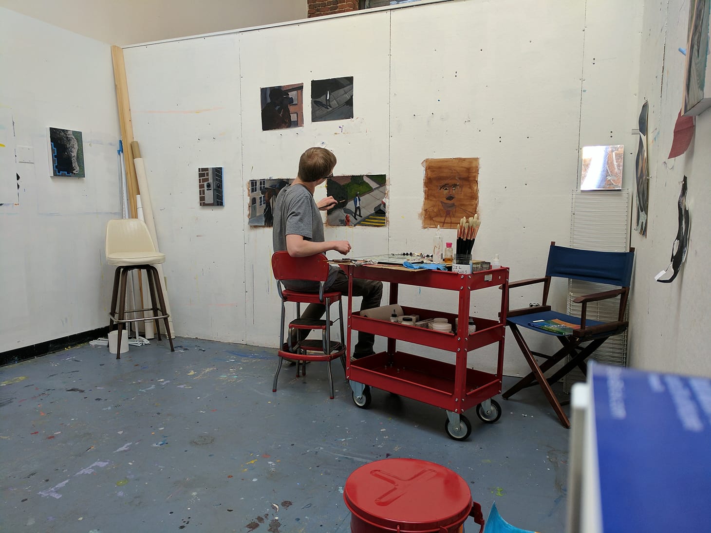 My painting process usually involves multiple paintings going on at once, so I keep three walls clear of furniture in order to have as much space as possible to hang the panels, canvas, or papers that I am painting on. I have a red service cart that I store my oil and acrylic paints and mediums, brushes, and palettes, which allows me to move between paintings with ease. On the fourth wall is my studio door, a small bookcase, and a tall workbench with storage underneath. I usually use my workbench to work on smaller paintings, collages, and drawings, which allows for me to spread everything out. Above my work bench I have an assortment of tools that allows for easy access while I am working. I also have two tall stools and a director chair, which makes it easy to move them around while I am working or to sit back to look at what I am working on.