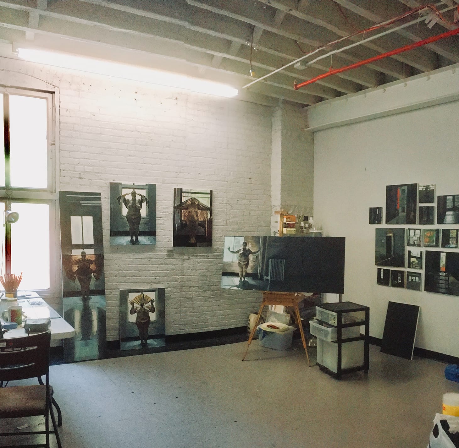 I have been working in the corner of a large floor in an old factory building in East Harlem, sharing this communal area with several other artists. It is very spacious, with high ceilings, fresh paint, and light streaming in from numerous windows. From those windows, there are charming city views, and I work to the daily cacophony of neighborhood sounds.