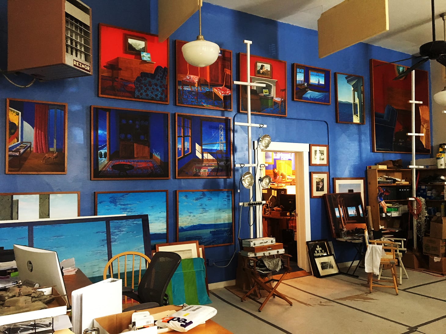 I just moved into a new studio in Petaluma, California after having been evicted from my waterfront studio of 42 years in San Francisco. My office and storage are through the door on the left. My main studio allows me to work on three or four paintings simultaneously. It’s a great new space for me in an old brick ice house built in 1898 that has been seismically retrofitted and has a few other artists and photographers, as well as many in the construction industry.