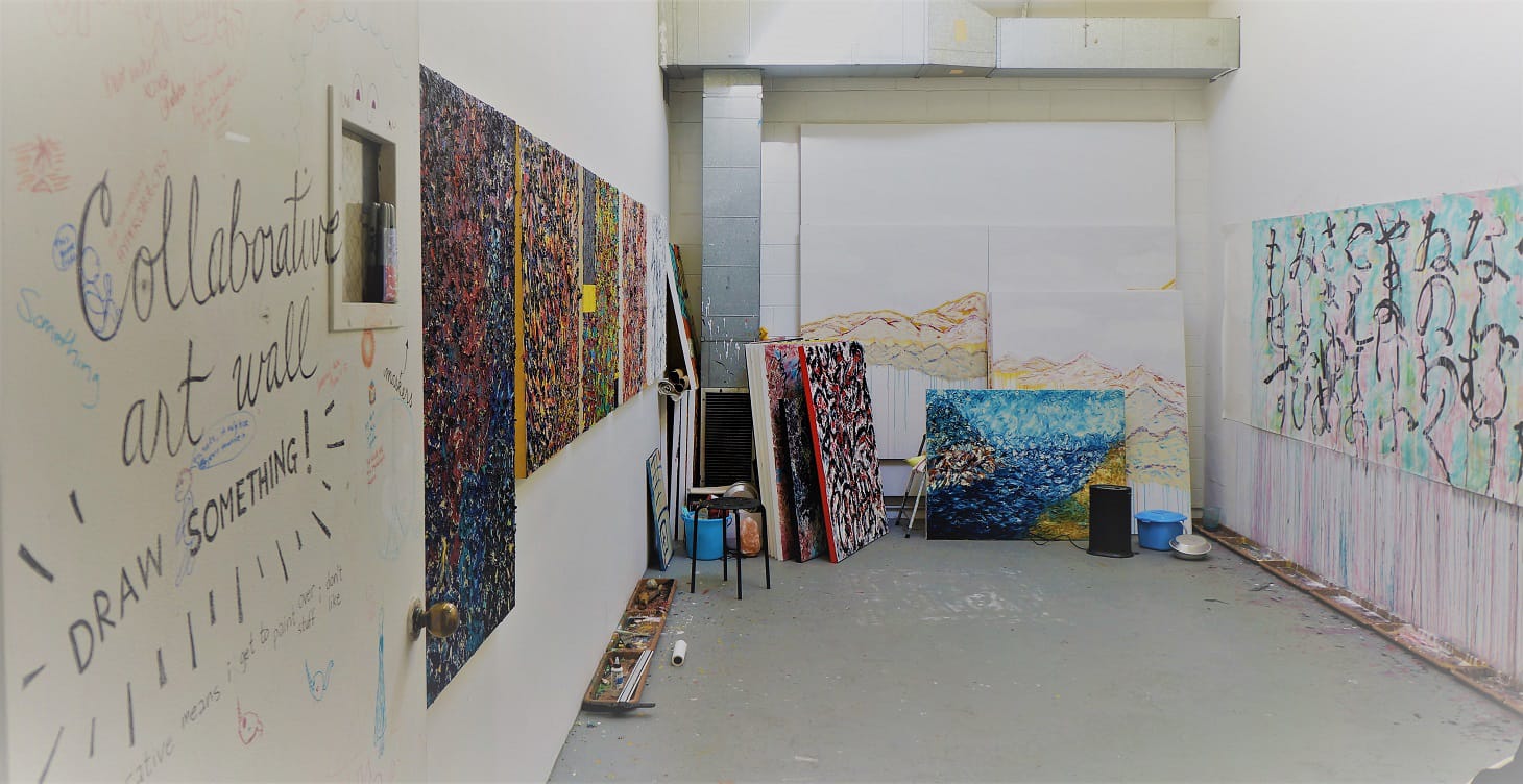 This is my studio at Claremont Graduate University, where I am a second-year MFA student. We have lovely skylights in our studios, but I was lucky enough to get one of the few with a door, which I have converted into an art wall. I generally work vertically, with my canvases (or paper) hung flat on the wall to take maximum advantage of gravity’s pull on ink and paint. The high ceilings allow for long, scroll-format works as well as landscapes. The little black Honeywell air purifier in the back corner is de riguer for oil paint and Chinese ink. It’s always the first thing I turn on when entering the studio. Turning up the A/C is usually second. It’s Southern California, after all.