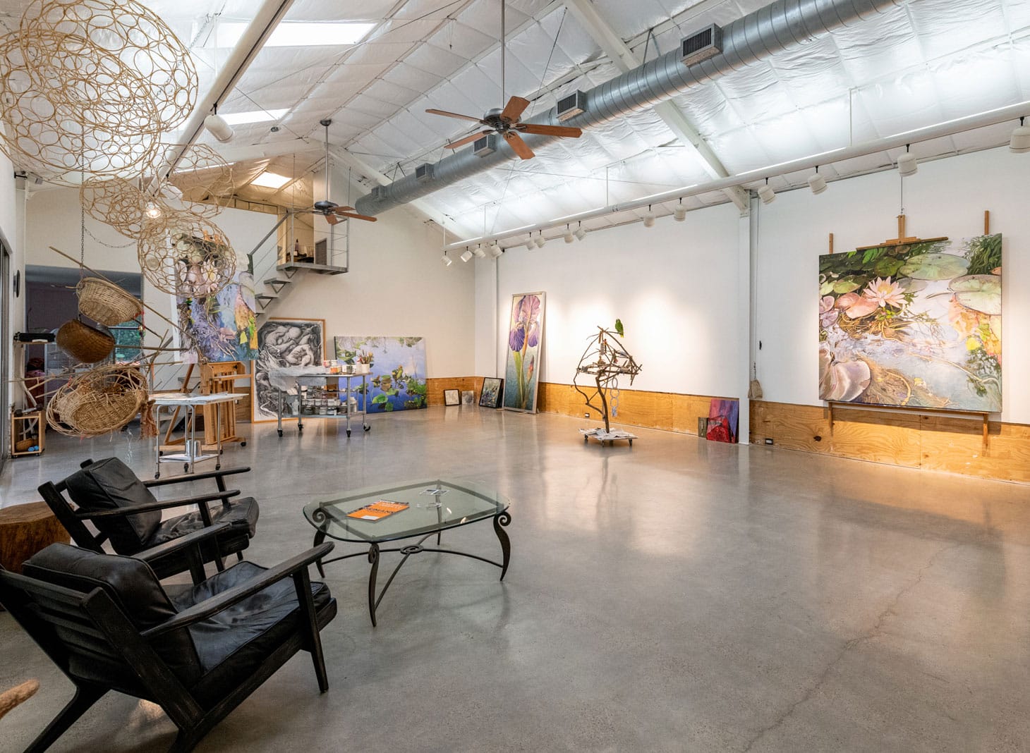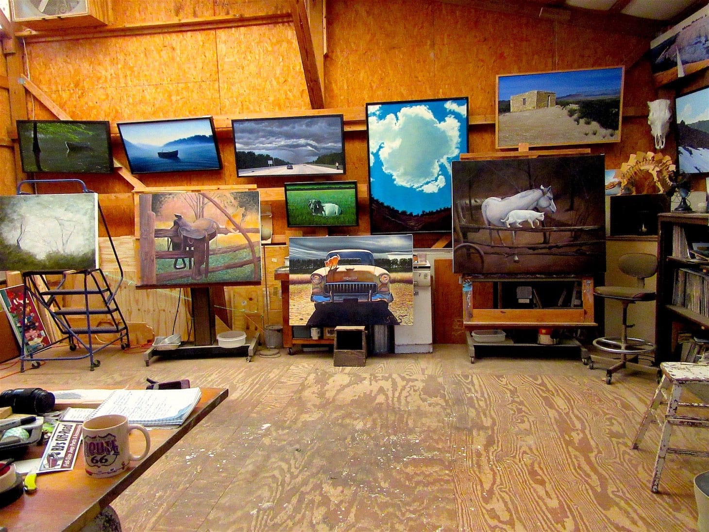 The two main easels you see here are repurposed electric drafting table pedestals that I converted to easels. The foot pedal at the bottom moves it up and down, and each easel can accommodate a painting up to 10 feet wide. I usually have three to four paintings going at once. I’m known as a landscape painter, but I have a lot of animals in my life, and my studio is surrounded by a wildlife preserve, so animals are slowly creeping into my paintings. And that’s just fine with me. (Chair on right for scale.)