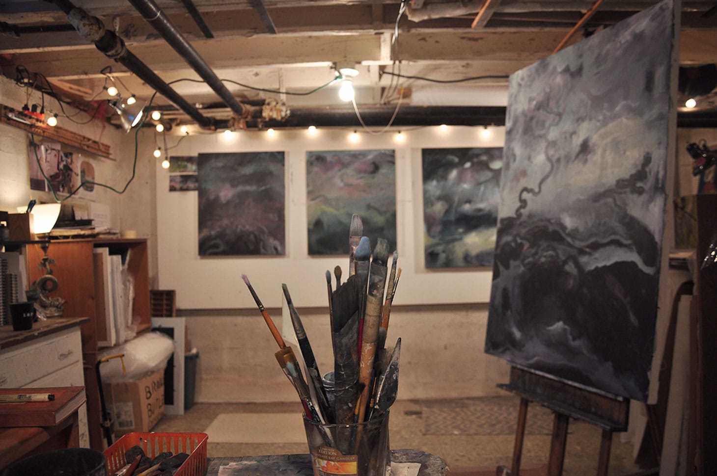 When my wife and I bought our house in July of 2012, I knew the basement had potential for me to carve out a great space to make paintings. The studio is 230 square feet and has room for me to work on multiple paintings at once, storage space, and a sink. I built a four- by 12-foot wall for working on paintings on paper and mounted it to my concrete basement wall. Lastly, working in a subterranean studio feeds into the imagery in my work. I tend to gravitate towards dark, muted colors, and the feeling of being underground inspires me every time I walk down those stairs to turn on the light.