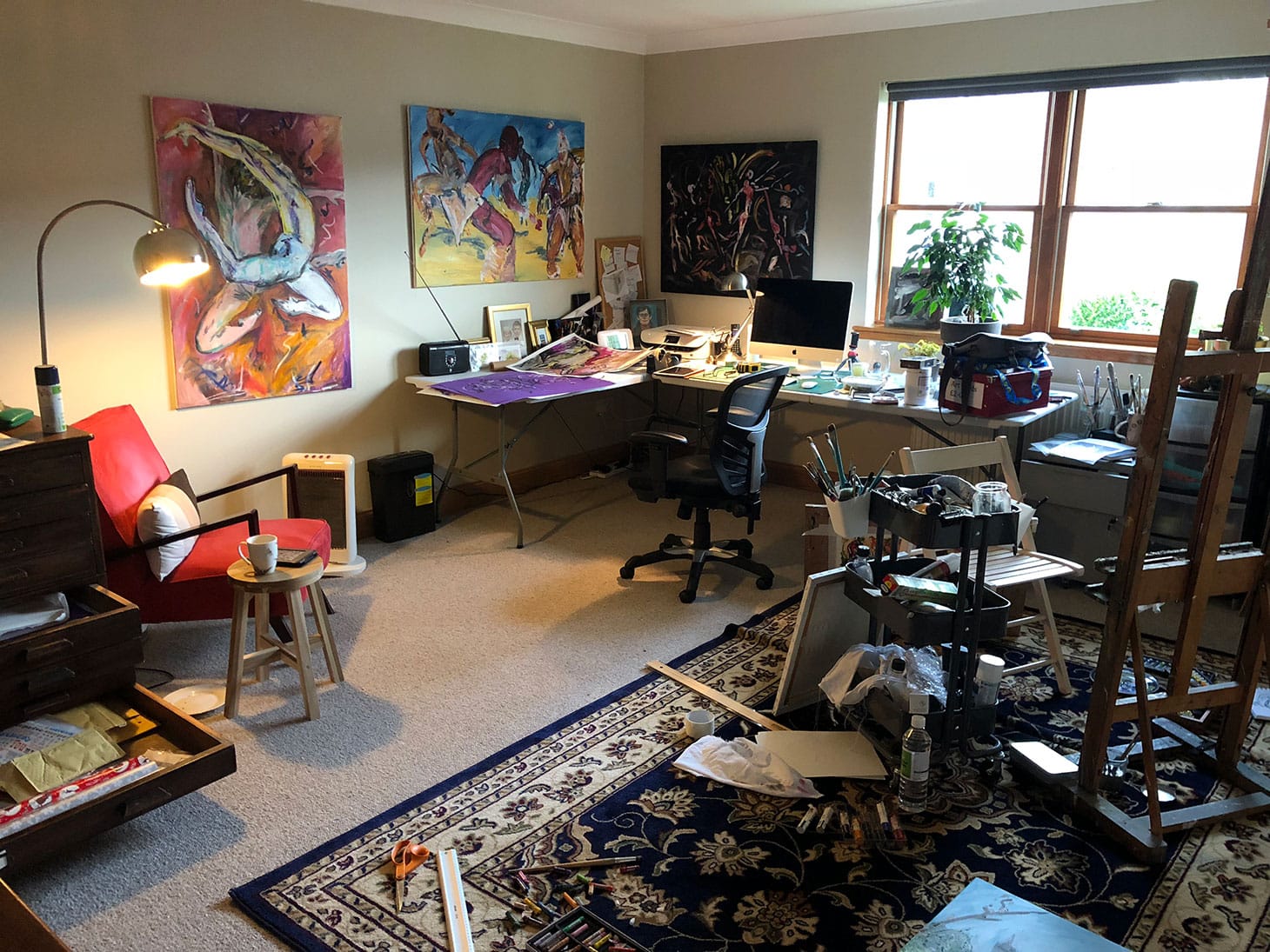 My studio is in a room in my home in Scotland. As you can see, I work on a number of projects at once and tend to spread out. My partner thinks I’m crazy because I don’t always close the drawers of my plan chest where I keep works on paper. The top on the chest is the right height to stand and work. Next to the chest is a reading chair where I often contemplate where I’m going next on a work, and it has a good view of what’s on the easel. (I have lunch here deciding what needs to be changed on the easel.) The tables make a good area to work on admin and paint. Most of my work happens on the easel or on the floor. I can let go with more abandonment here, and I have a rug over the carpet to protect the home flooring. It’s also warm, as tend to work barefoot.