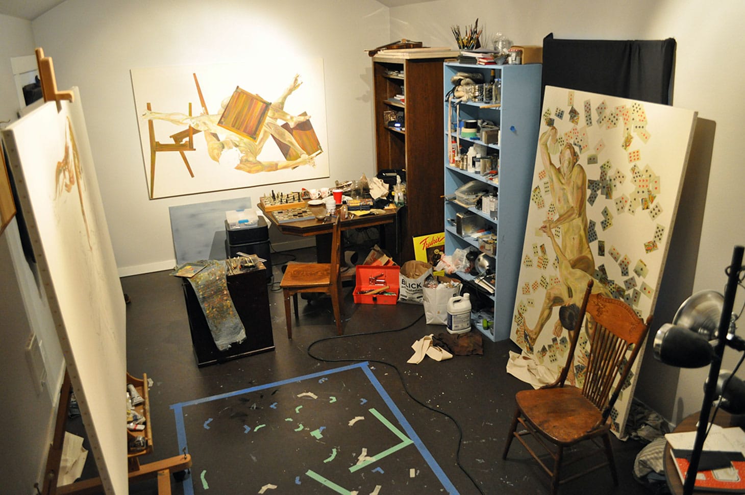 Look at the tape on the floor. Here, three colors of masking tape — blue, green, and white — reflect the work on three big unfinished canvases. My time as a ballet dancer has left me with a fascination for picturing moving bodies in novel ways. So I choreograph my models, spiking the floor, walls, and even the ceiling with tape to show them what points to hit while they move from one position to another, and back, and again and again. I work with live models whenever I can, and I carefully control lighting during the months-long slope of time it takes to finish these paintings. So, tape. Over 30 or 40 sessions, the models and I supplement the tape, repair it, adjust it, and when the paintings are finished, we get to pull it off in a satisfying, informal ritual of cleansing.