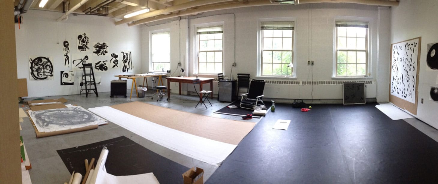 My studio is big enough to have space to move in — my life as a dancer informs my drawings in many ways. I have enough wall and floor space to make large drawings in both planes. I’m letting a roll of paper uncurl on the floor between sheets of craft paper. The studio is on the ground floor of a building that once housed the American Guernsey Cattle Club, and the windows look out onto a quintessential New England town, but my work has nothing to do with the view or the surrounding bucolic countryside. I have a low chair for reading and a little refrigerator for beer and wine when guests stop by.