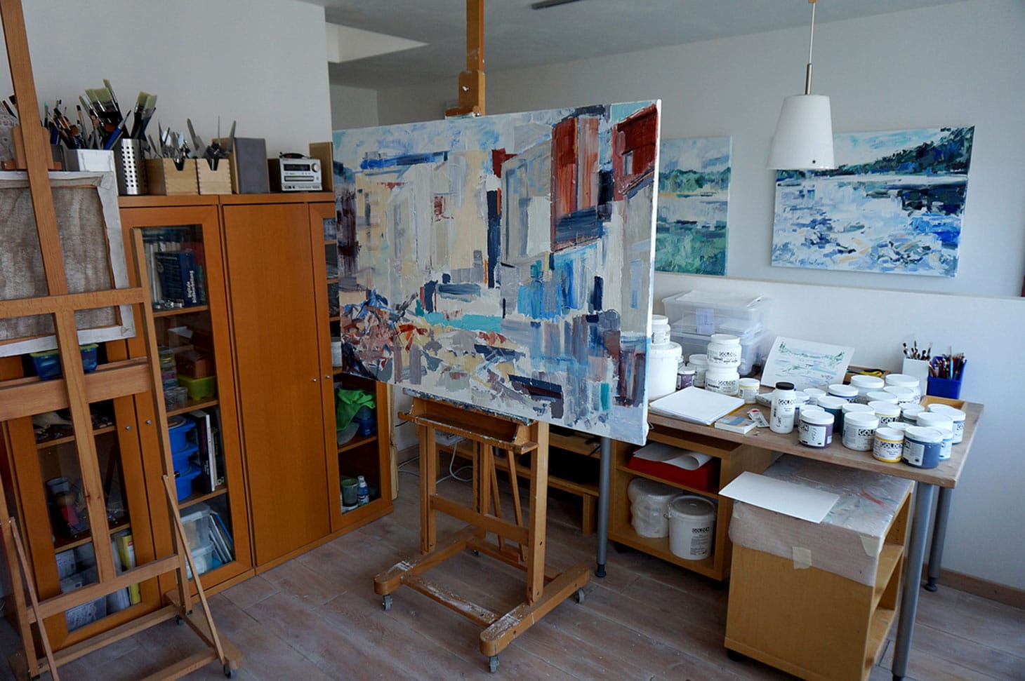 My painting studio on the first floor, in the foreground, is a work in progress. The source of inspiration is the build-up of a city. I work with water-based acrylic paint, as it is more environmentally friendly. The studio is near the bedroom. On the table is an iPad drawing, which served as a study for a landscape. On the wall is a painting based on the scenery along the Isar in Munich. There is the possibility to listen to music. It is an important source of inspiration with its surprising elements of composition.