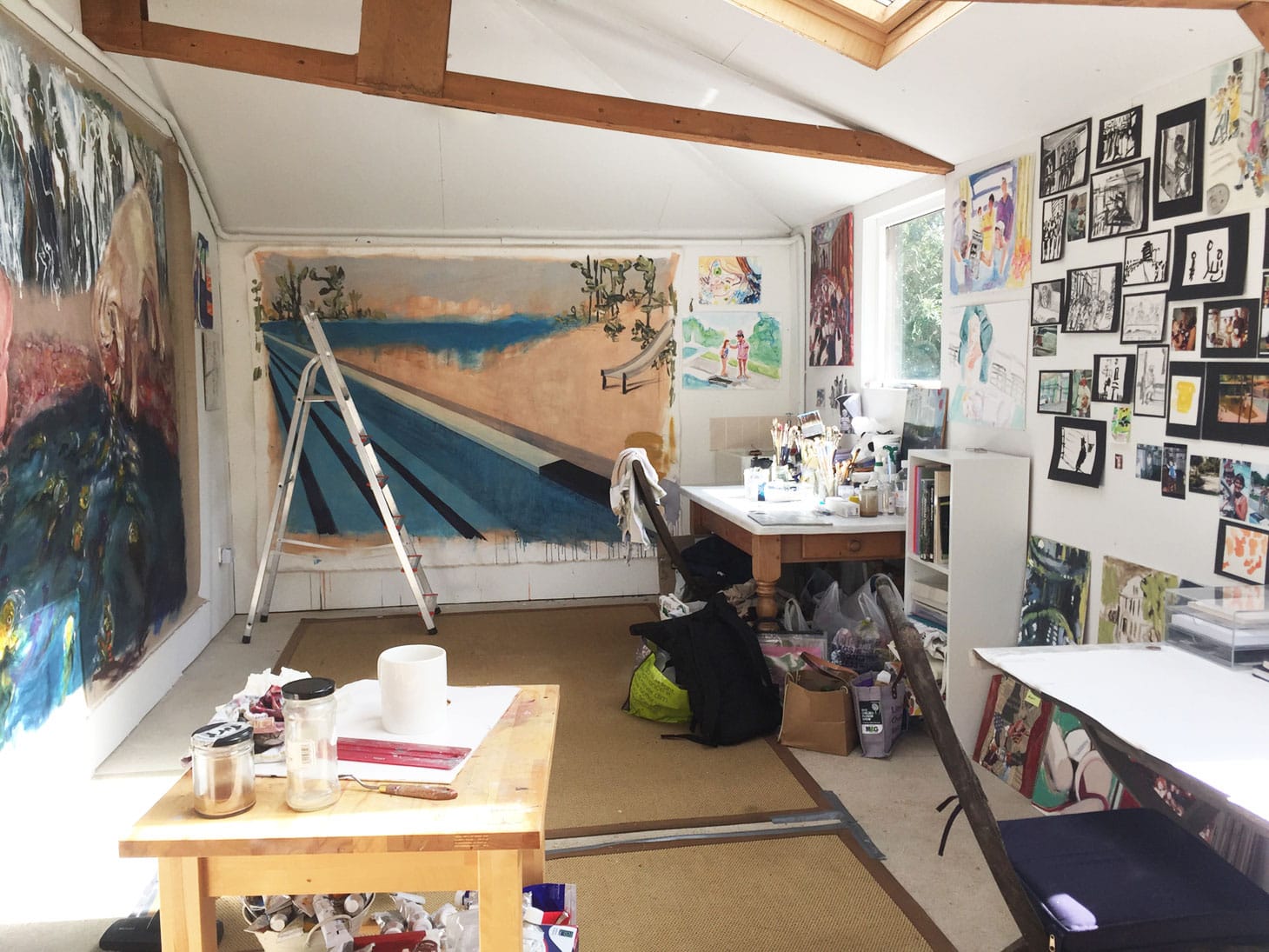On the right of the image is the “clean” area and brain-dump wall, which contains sketched images from historical events, music, pop culture, dreams, and personal photos. The large unstretched canvasses are works-in-progress, as I was completing my MFA at Chelsea College in London, and they contain references to giant tadpole-eating babies, OJ Simpson, Heinz pickles, Pittsburgh, PA, and the music of Beastie Boys. The old Ikea sisal rugs keep the studio warmer in winter and have featured as textural motifs in my work. I spend very long days in the studio fueled by multiple cups of chai tea and music from KCRW Los Angeles and BBC Radio 6.