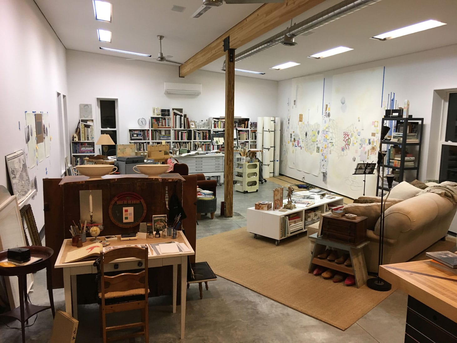 My studio — which I designed and built with structurally insulated panels in 2015 — is a loft set in the woods: a live/work space 90 miles north of New York City. I work on two opposing walls making paintings on paper, pinned directly onto the walls. I’m surrounded by books, magazines, and collections of objects, postcards, and old frames which feed my accumulative, collage-like way of painting.
