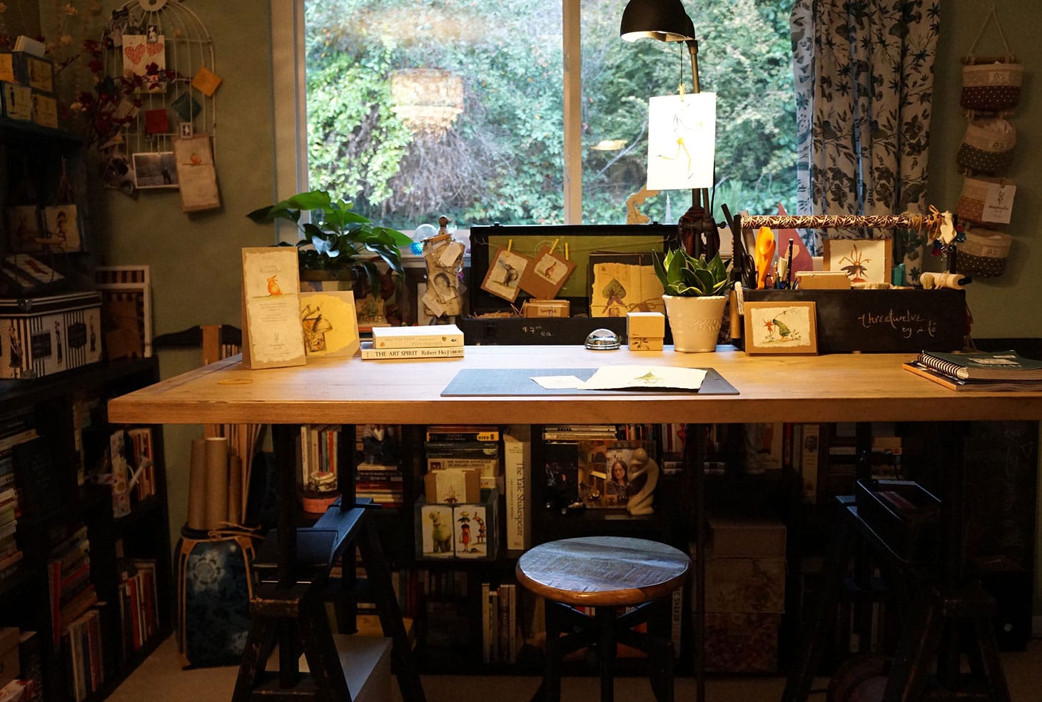 This is where I sketch, paint, and design handmade products for my shop. My toolbox is an old carpenter’s box rescued from the discounted pile at a local thrift store. On the walls are whimsical prints and photographs of places I’ve visited. Bookcases line the bottom half of two walls. I love words: from great works of poetry and fiction to philosophical journals, strange and surprising ideas are always within reach. The two books that currently occupy space on my desk are The Art Spirit by Robert Henri and Your True Home by Thich Nhat Hanh.
