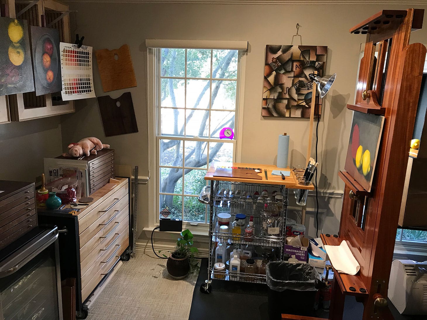 I’ve worked out of my Carrollton, Texas home studio since 1998. It’s 15 by 15 feet with high ceilings and an abundance of north light. There’s lots of space for my easel, a drawing table, storage for art materials, and paintings that hang to dry along the walls. I stretch/size/prime canvases on a large workbench in my garage during the summer months. There’s also plenty of room for extra stretcher bars on shelves that I installed.