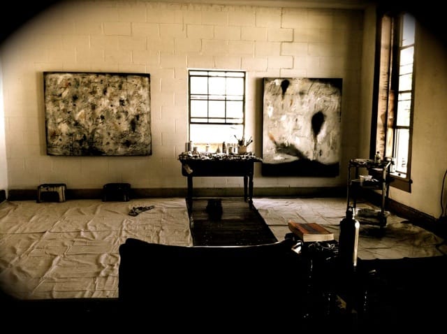 My studio is in an old pre-Civil War two story building from 1845. My daily routine varies from day to day. I try to get in there around 10:30am and work till about 5pm. My day will consist of prepping canvas, building stretcher bars, studying my works from the previous day, and of course painting. I use primarily oil, and cold wax medium. To apply the paint I use a bit of an unorthodox method of rags, spatula, hands, and brushes. mixed with charcoal, oil sticks, and sometimes found objects pushed into the paint to give the canvas texture.