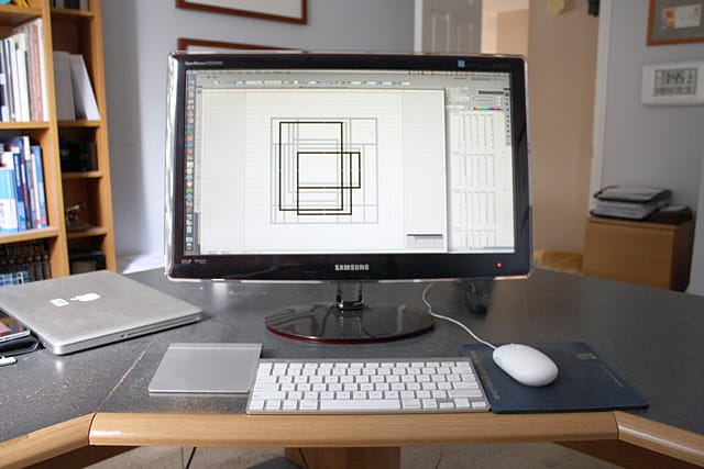 Being a digital artist, my studio is my laptop. My current art-making tools are Microsoft Excel, Adobe Illustrator, and Adobe Photoshop. I start by using Excel to generate randomization within a compositional framework. Then I use Illustrator to build compositions based on the Excel data. The Rectangle Tool, Color Panel, and I have become good friends over the years. Finally, I use Photoshop to scale and prepare the images for print production. And of course, no studio is complete without iTunes providing a working soundtrack.