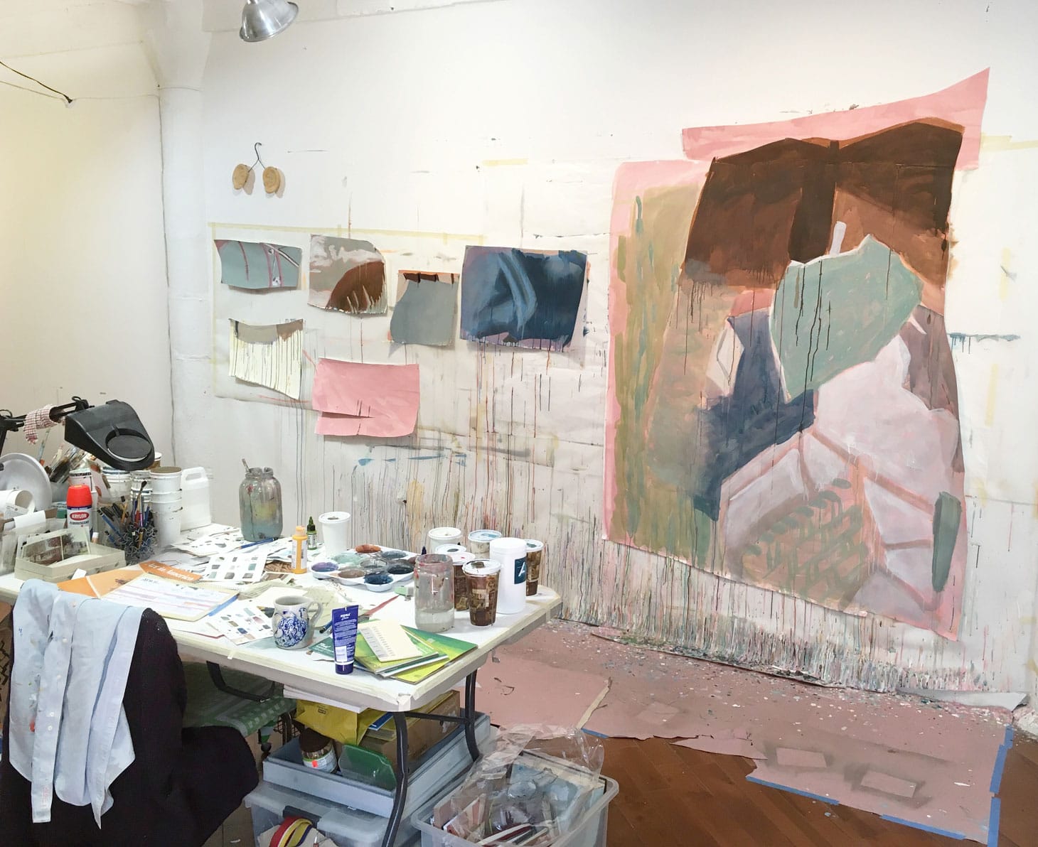 I share a studio with three other artists in the former Jones Brothers Grand Union Tea Company building in DUMBO, Brooklyn. The space is a rectangle with one long white wall. This is my area. Primarily made up of a cluttered work table and a plastic-covered painting wall, I shuttle between both when I am in the studio several days a week.