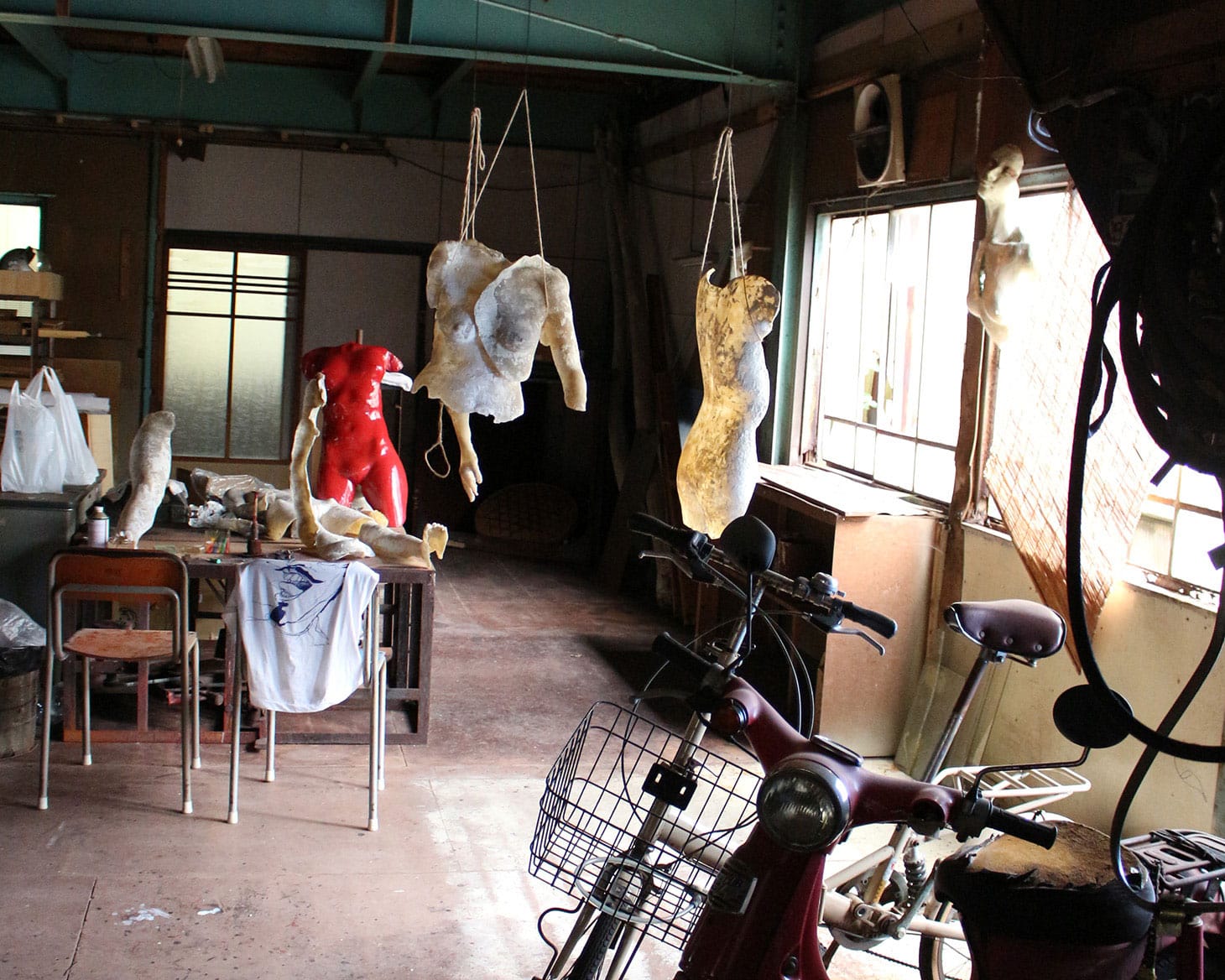 The building is unique; it has a traditional Japanese composition like the old wood houses but uses steel in its construction. It’s very convenient; I can adapt the areas according to my needs. The basement floor is dark, but on the second floor, the sunlight illuminates the area. I renovated the ceiling in order to create big sculptures, and I enhanced the place by making tables and shelves using the scrap materials left there. While I’m creating my artworks, from time to time I’m still making changes constantly to the space. It is a little far from my house, but I wouldn’t like to live there because I want to make it a special experience. On the way there, I can concentrate and think about what is next.