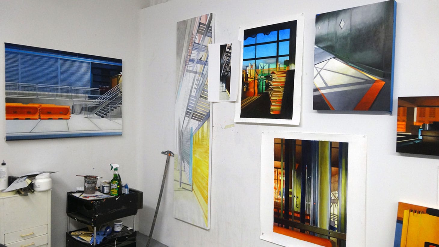 What you see in the photo are several works on paper and paintings on board and canvas. I work from photographs of architecture that I take in New York City. The vertical unfinished work in the center is based on a photo-montage of several images which I combine in Photoshop before I paint.