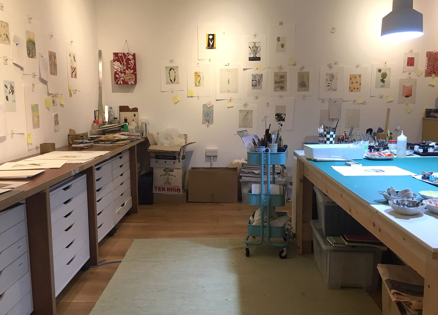 My studio is adjacent to the living area, with an easy flow back and forth. It’s a new space, very clean and white. I need lots of walls because I like to work on several pieces at once. You can see scattered post-its, there to keep track of choices, ideas, and prompts. I stuff them into the gorgeous deGournay shopping bag (hanging in the corner) when I am done. Those drawers are full of paper, finished art, and work that I need to not look at for a while.