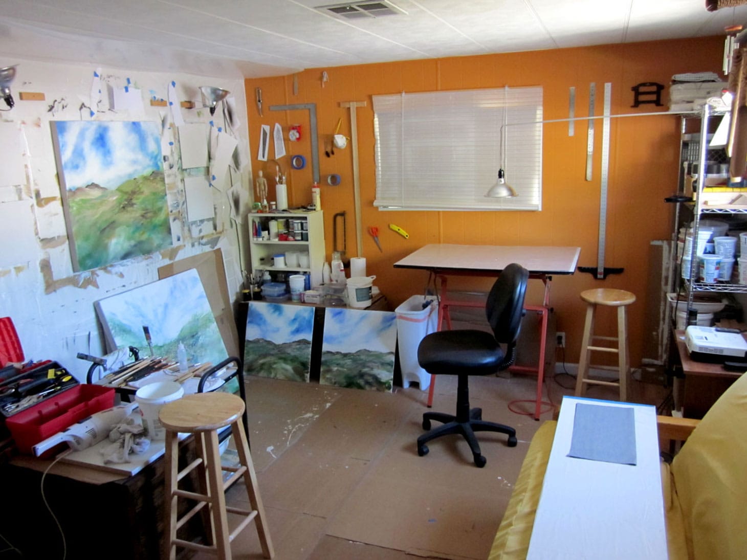 I’ve developed a landscape style that involves a very wet surface that is smeared around with acrylic pigments. I usually work on four to five paintings at a time, and after they dry I add details with stencils and spray paint. The space is also used for small framing and repair jobs around the house, since I keep all my tools and paints in this room. In addition, I create instruments and decorative objects out of gourds, so this room serves many purposes. The main table is shown cleared off since I’m ending one project and about to start another. I can still accommodate guests when they visit, and it’s great because they don’t have to worry about making a mess of the spare bedroom or bathroom sink.