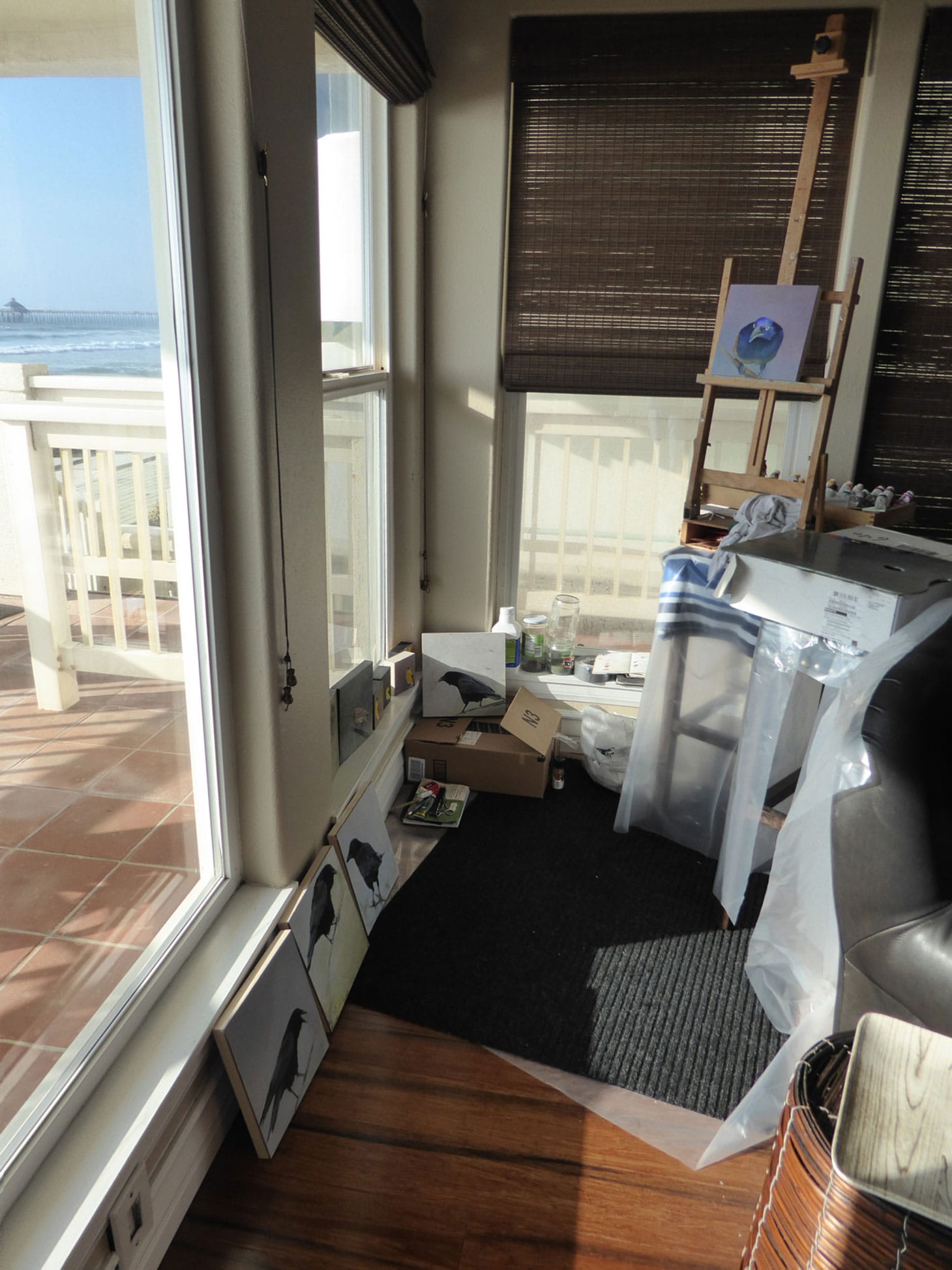 The view from my easel here is the space I carved out of the Imperial Beach, CA condo we are in. I’ve draped plastic over the stools I’m using to prop up my easel and palette. I purchased a cheap rug to protect the floor. The windows face west and can be too bright toward late afternoon. But finding good light in the places we stay is the primary goal, and this spot suits that well. The main challenge here is space to stand back and observe works in progress and to work on several pieces simultaneously.