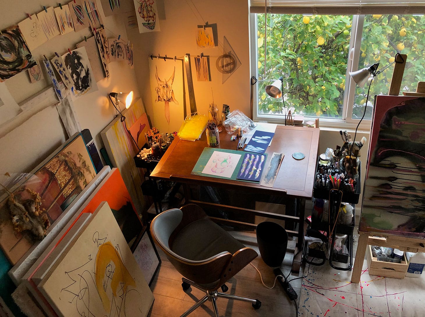 Easy accessibility is something very important to me in my workspace. I hang drawings that I intend to revisit, and I keep them visible, rather than throwing the pages into sketchbooks. The same goes for canvas and panel paintings. As I continue to observe my progress across many works, I am able to keep a visual diary of changes in my style, interests, and color palettes.