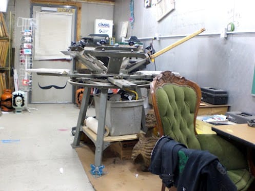 Since starting my 366 mail art project I enter here every morning coffee in hand to sit at my desk and create a 4×5 card. This is where having a space and a screen printing press comes in handy to be able to make my own prints, cards, shirts, experiment, and play. Another reason I never spent a lot of time building my studio out into a gallery room is I make messes. Be it painting, printing, collage, paper mache, making masonite cutouts or designing tanks I am making a mess.
