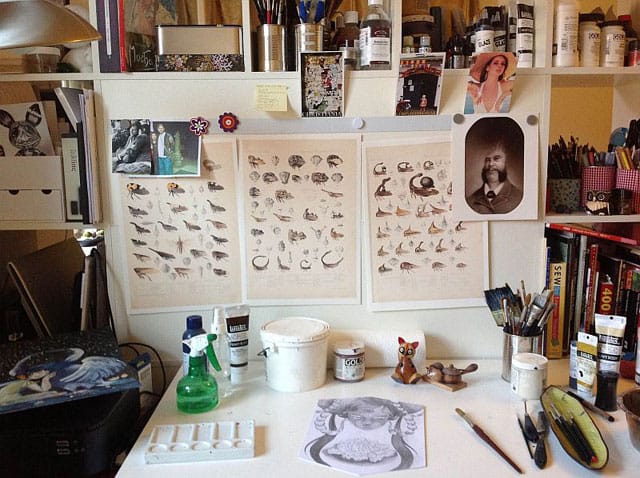 I work on raw wood panel which involves a lot of drawing on a flat surface. Because I work in my home and have a small bird (cockatiel), I switched entirely to acrylics for health reasons (Golden is best in my opinion). I work on raw wood and let the wood grain dictate the atmosphere of the piece. I prepare the wood with clear gesso and draw the images in graphite. When I want to add paint, I pull out the large easel on the left, and put it back when I am done. I glaze the images slowly with acrylic glazing medium, and refine with graphite and colored pencils as the final step.