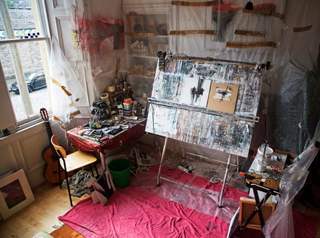 The walls and floor are covered in bubble wrap, to protect them from my sometimes over-enthusiastically applied paint. When the wind blows at the right angle through an open window, the sheets wave and rustle gently. At the times when I really need to concentrate, I put some bubble wrap over the windows as well, so that the activity in the street outside doesn’t catch my attention. I listen to music on headphones as well, for the same reason.