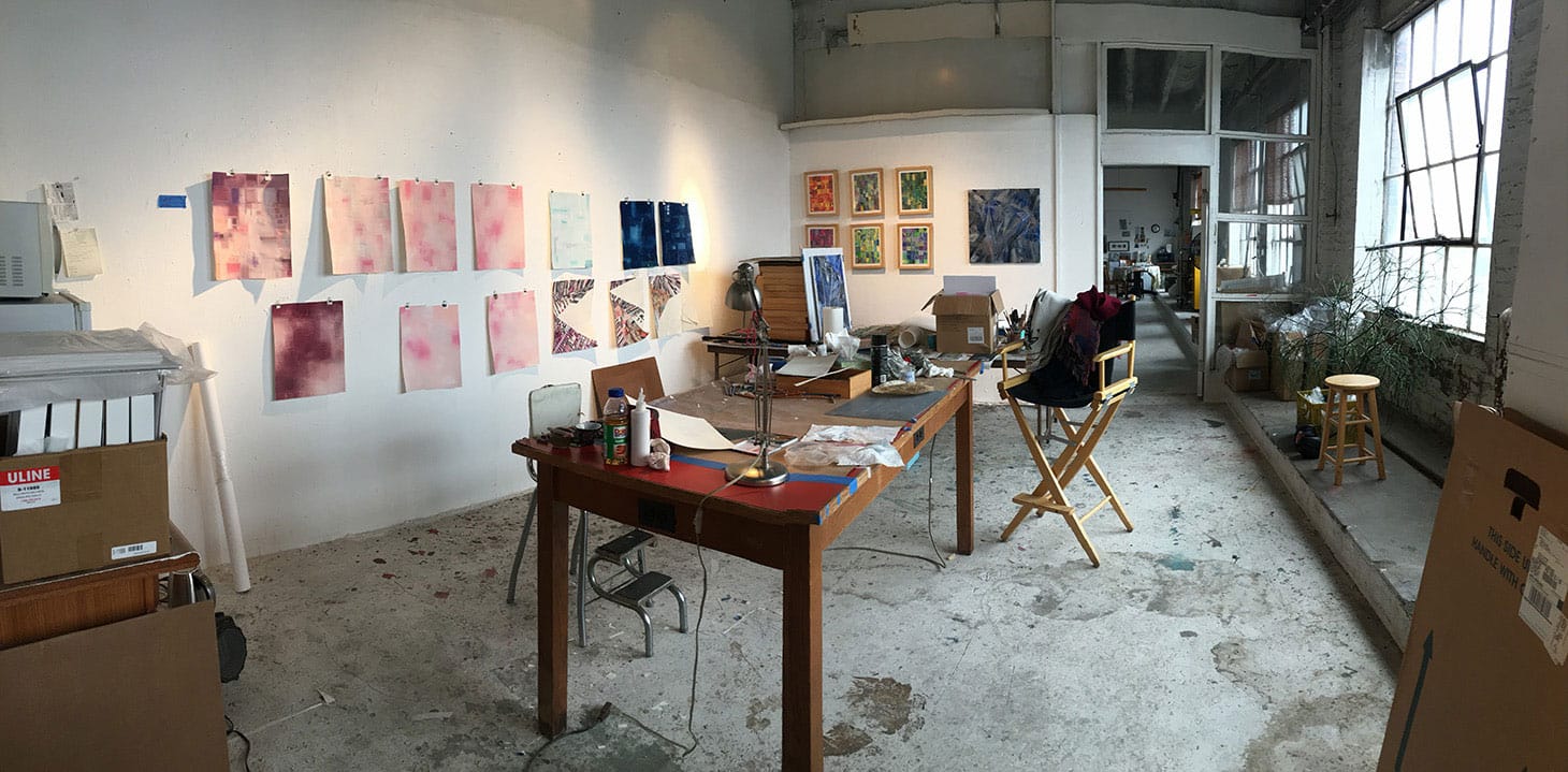 This is part of my studio space located in Pittsburgh’s Squirrel Hill neighborhood. There are five artist studios on one floor of a building that is otherwise used as a car garage for the apartment building next door. It feels like a secret hideaway each time I arrive to work at my studio, as the entrance is on a residential side street next to the garbage collection. You enter through a door marked “Refuse,” walk down a long, dim hallway and up a set of stairs into a common area filled with art and plants.