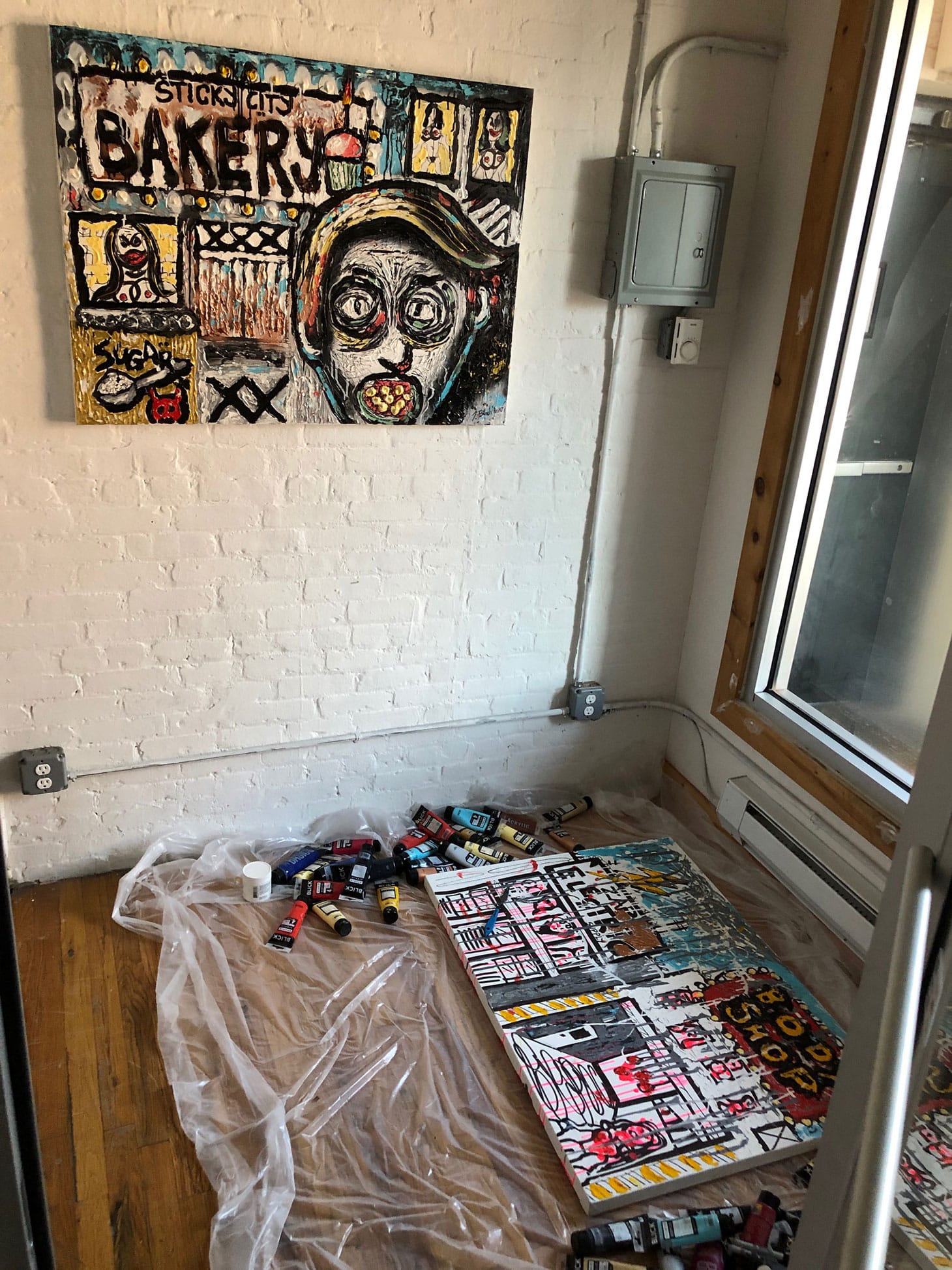 I’m working from a small space behind an elevator in Dumbo, Brooklyn. It has natural light and a view of the area from the fifth floor. Many artists work in the building. It’s about 6 by 9 feet, so it is kind of an art closet, studio space, storage, and tiny gallery. It has a glass window and door so people may look in when I’m not here.