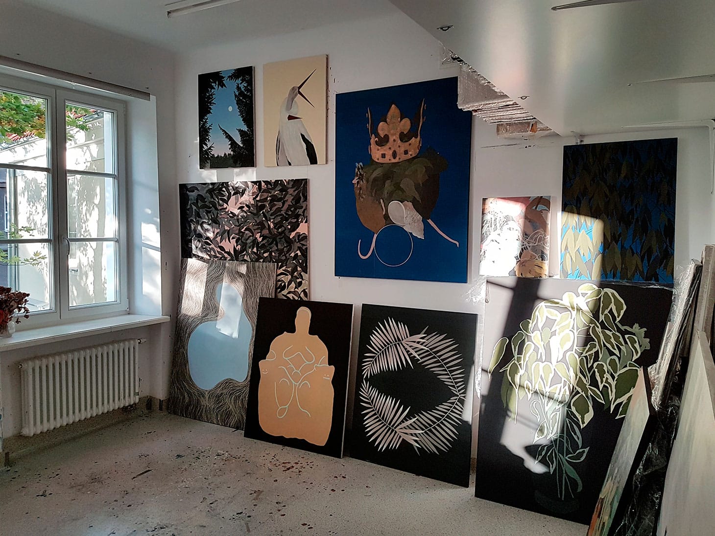 The main wall in my studio is the place where I hang paintings to see them when I’m preparing an exhibition, or when I have a studio visit. That’s why the view is constantly changing. The space is not big, and I keep it organized, so I could work in several techniques at once (I use egg tempera on canvas, and I work with textiles, like paint on silk).