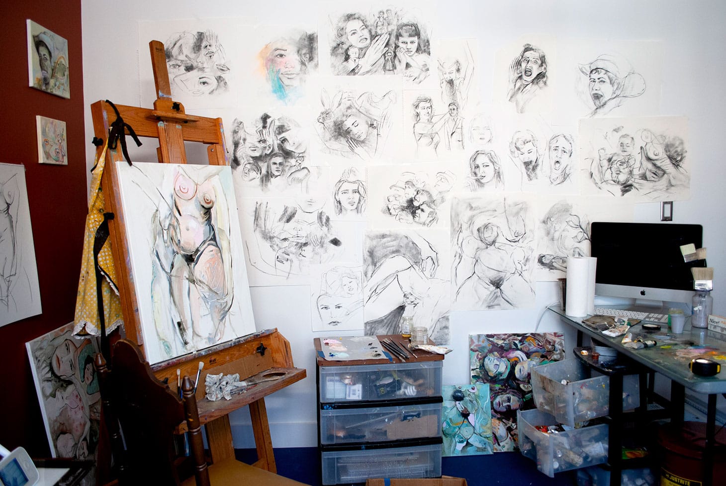 My studio is in a spare bedroom of my apartment, mostly for convenience so that I can work at weird hours and in short spurts (I’m a new mom — note the baby monitor in the corner of the shot!) I create fast, messy charcoal sketches in a very stream-of-consciousness fashion, and use them as inspiration for my paintings.